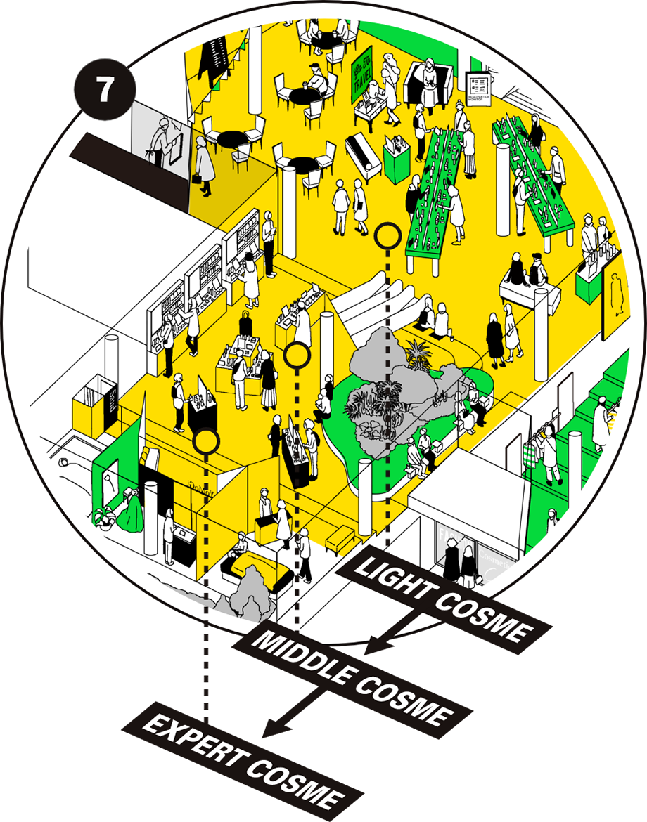 LIGHT→MIDDLE→EXPERTと興味度・専門度別の売り場をグラデーション状に構成。自分よりすこし上級者を見たいという欲求を満たし、来客者自体がPRとなる階段状のワンフロア。