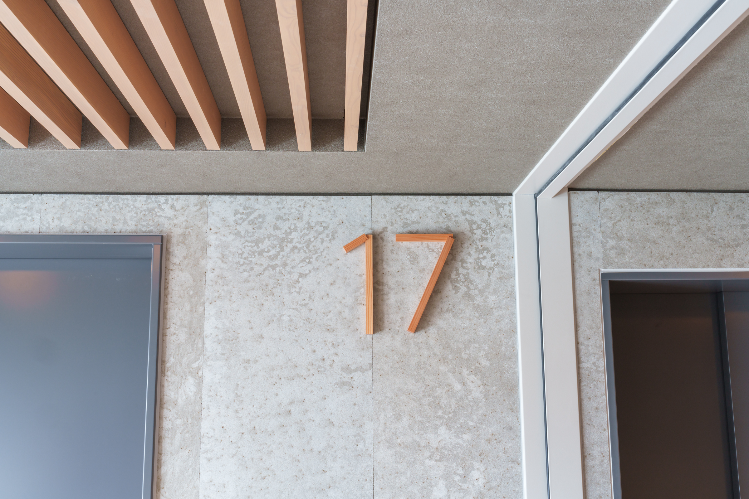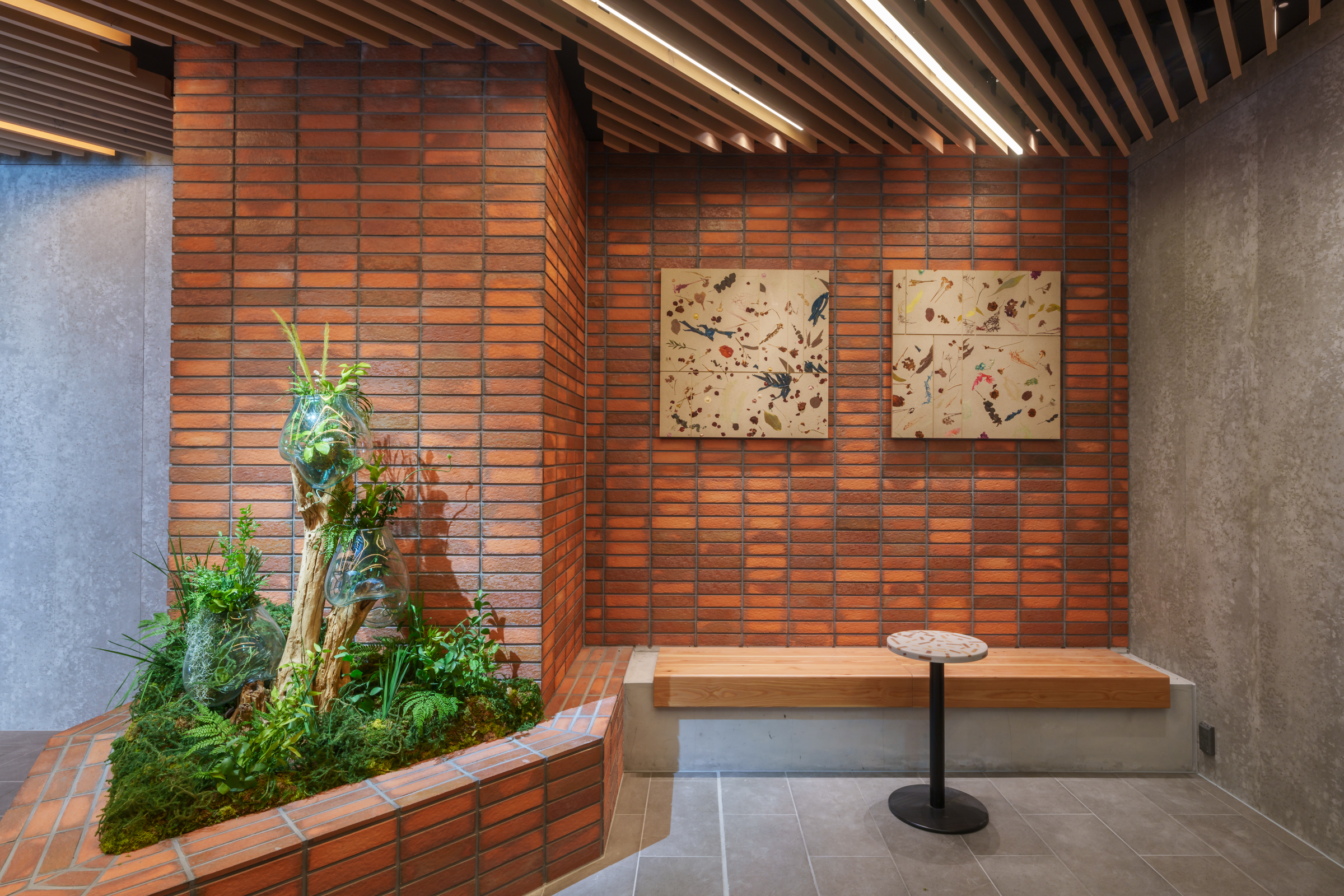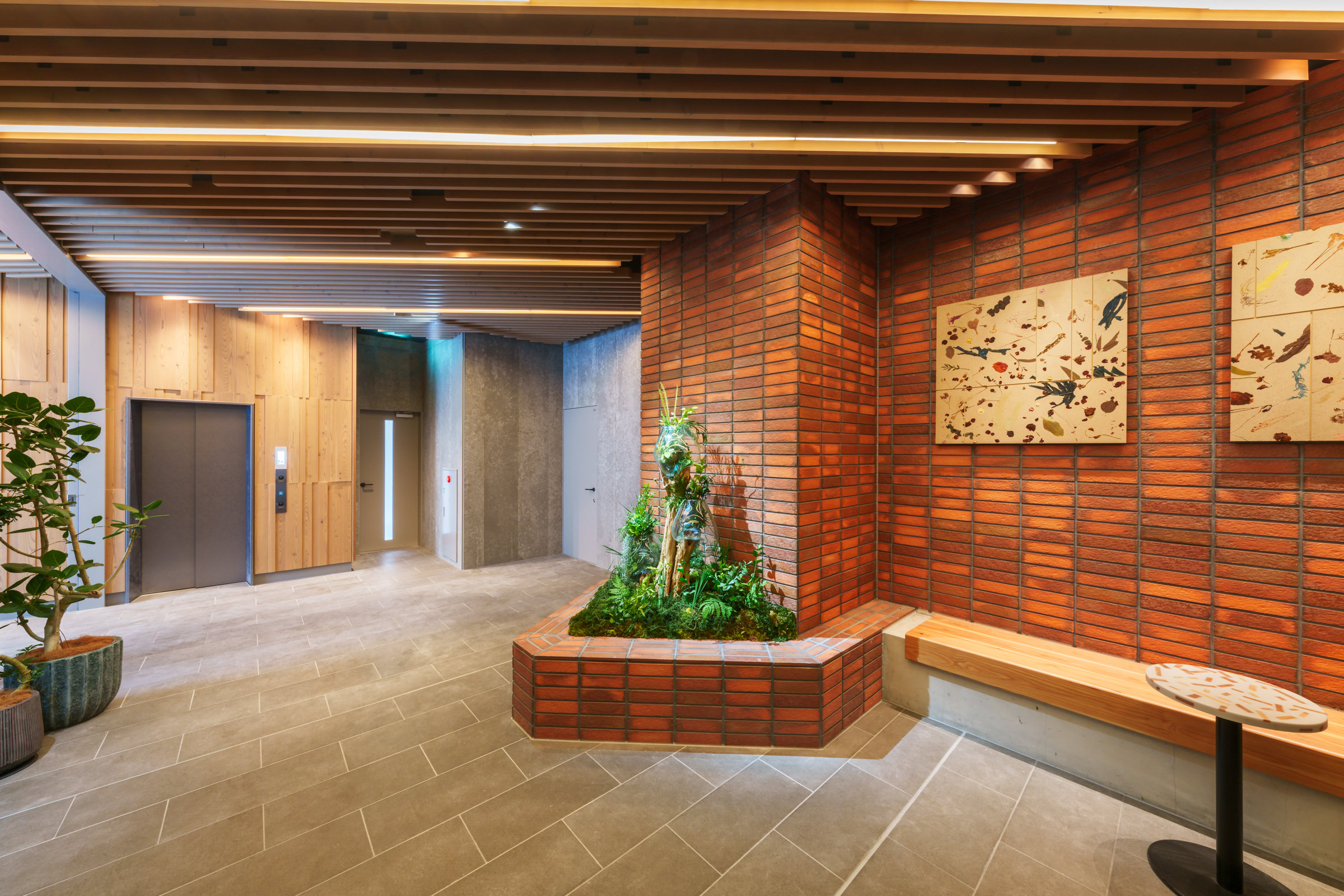 オフィスと集合住宅が複合する新築ビルのレジデンス共用部において、間伐材の新しい価値化を図るとともに、居住者に向けたシェアグリーンサービスの企画実装、内装デザインと家具や什器などの製作を担当しました。