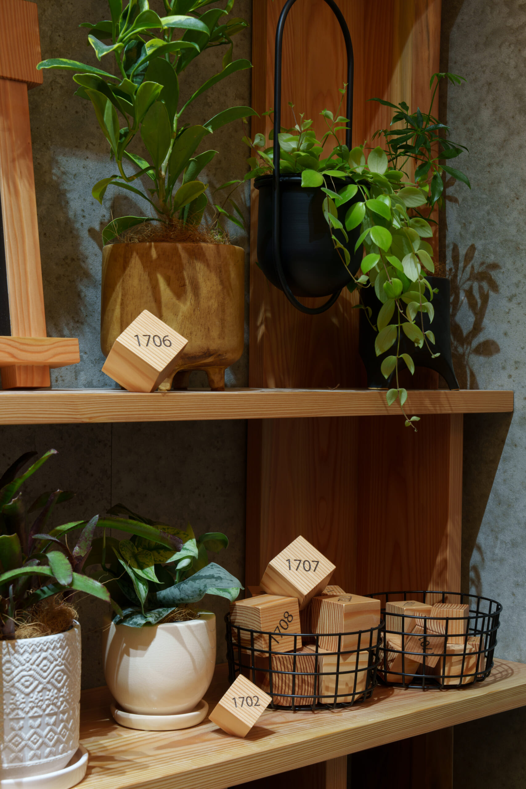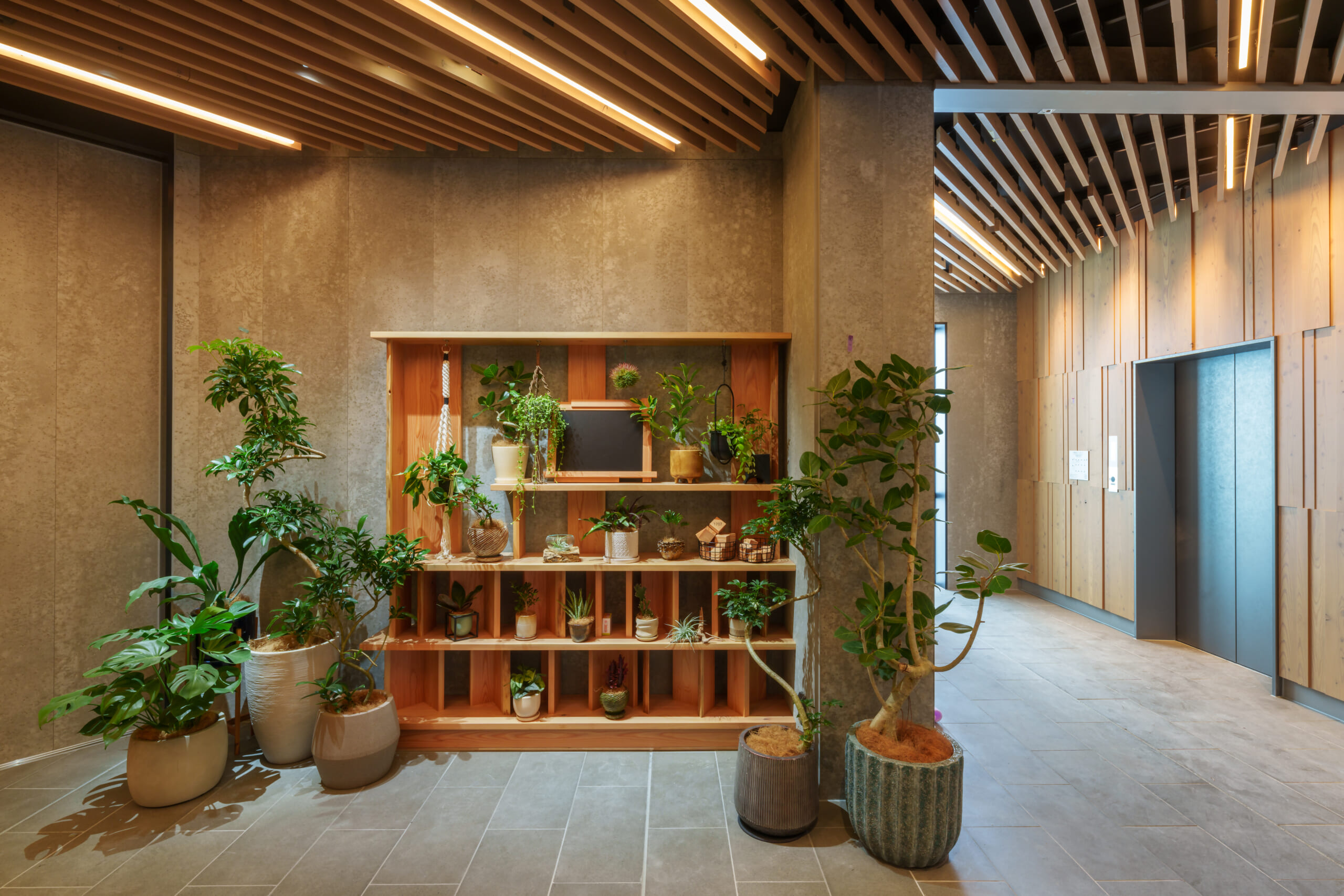 地域の人、暮らす人、働く人にとって、ウェルビーイングな空間となるように、クライアントが所有する保有林の間伐材であるカラマツを、壁装材や天井意匠、家具、サインなどで積極的に活用しました。居住者に緑豊かなライフスタイルを体感いただけるよう、共用部の棚には植栽を並べ、自室まで持ち帰ることのできる、シェアグリーンサービスを導入。都会にいながら木と緑を多様に感じられる、安心で心地よい空間を実現しています。
