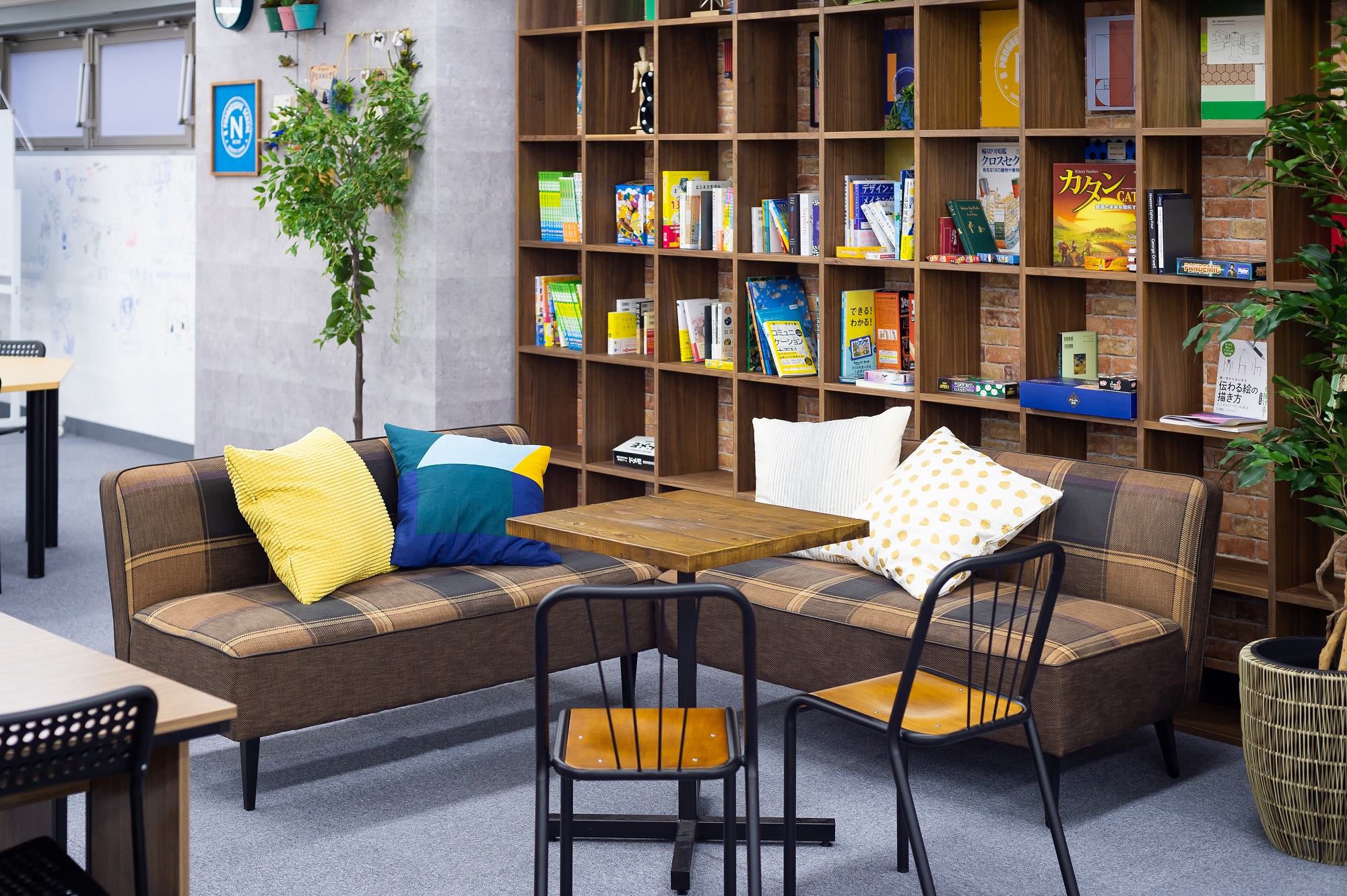 設計では、生徒一人ひとりが心地の良い居場所を見つけられるように、様々なテーブルやソファを丁寧にレイアウトしました。書籍やボードゲームを集めた本棚、壁一面のホワイトボードが創り出すリアルなアクティビティと、ネットを活用したコミュニティが融合する創造的な空間になっています。