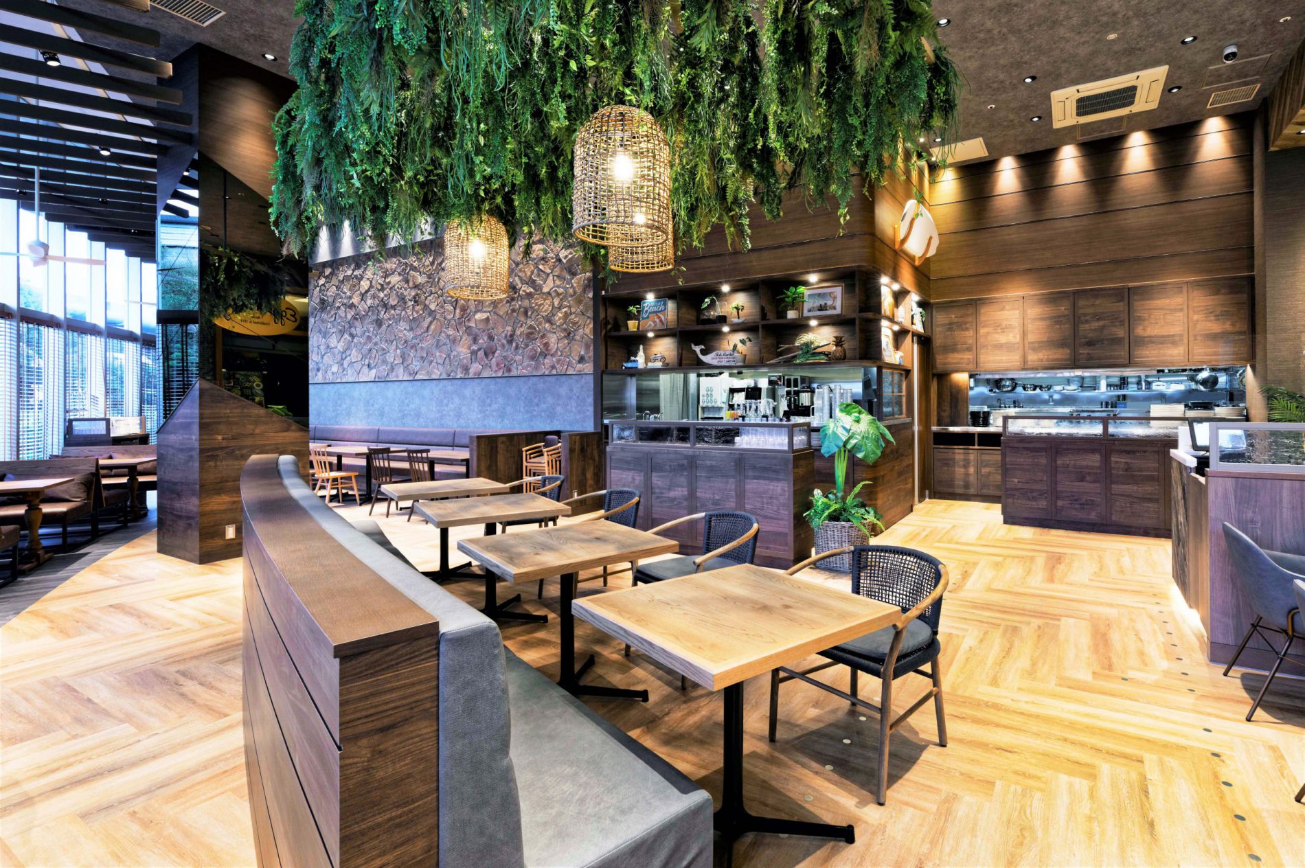 屋外で使用される家具や割石風のタイル、フォトジェニックな木漏れ日を感じるベンチ席などを空間に組み込むことで、リゾート感ある上質な雰囲気の中に、どこにいても屋外の質感が感じられるようにコーディネートしました。