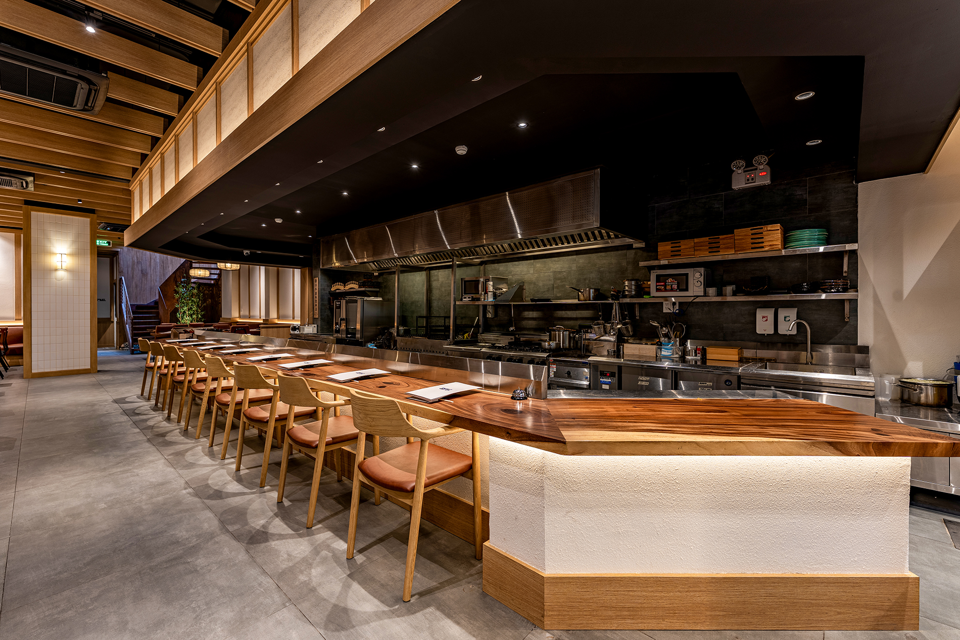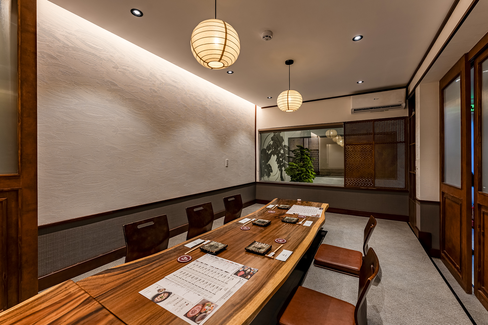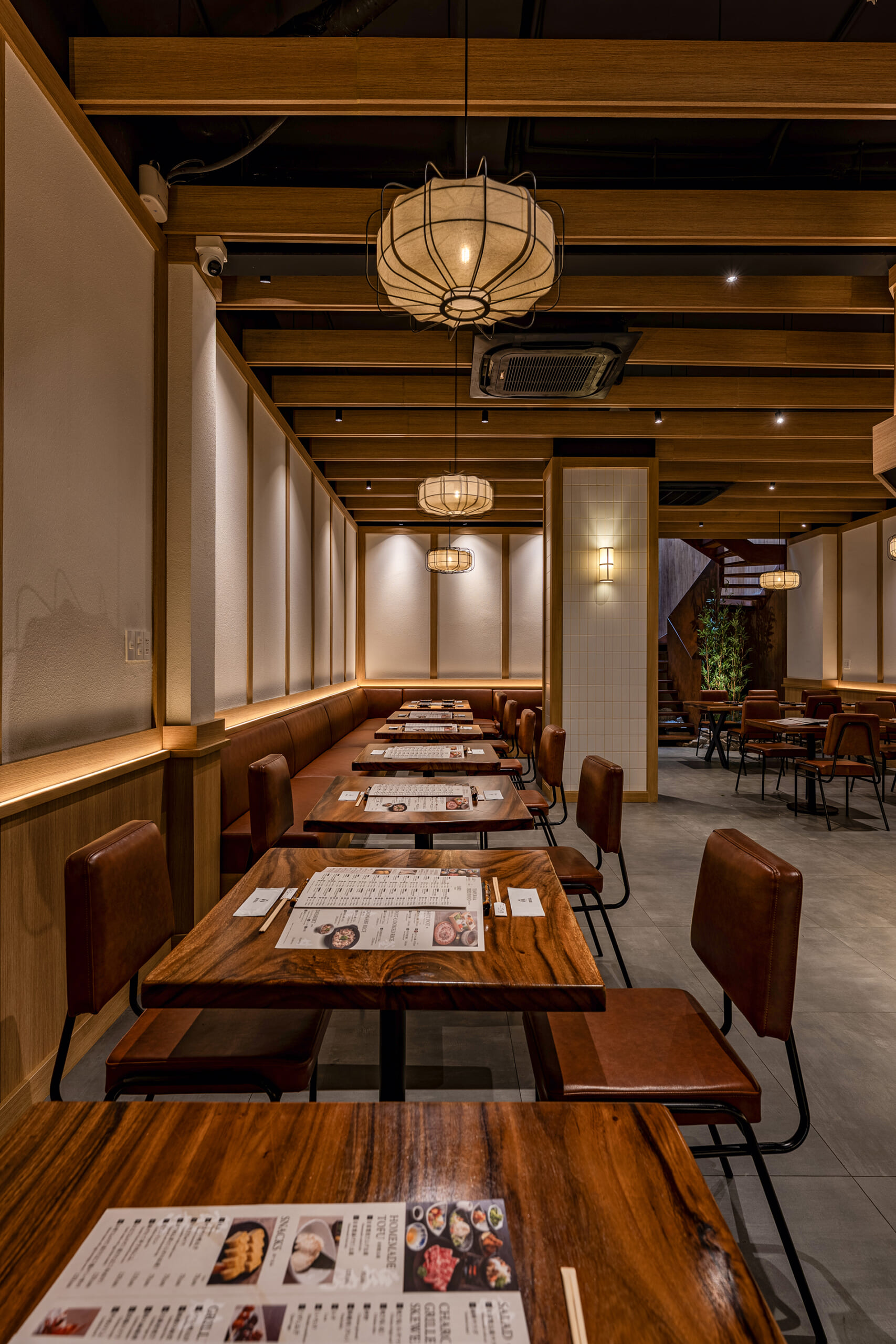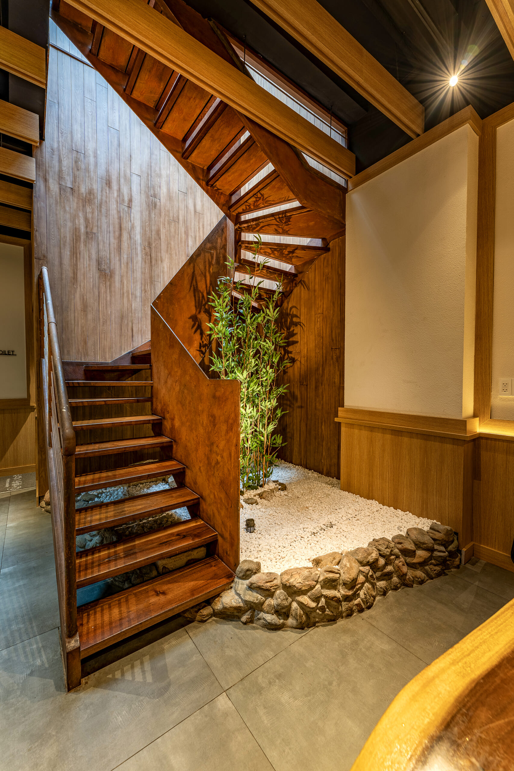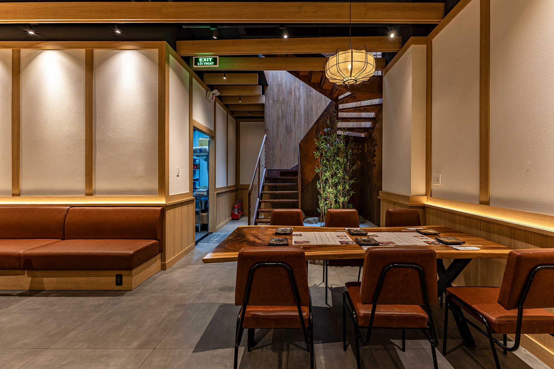 “モダンJAPANESE居酒屋”として、普段のお食事から大切なお客様との会食、個室でのプライベートなひとときまで、幅広いシーンで日本の美味しい料理とおもてなしをご堪能いただける場を創造。清潔感のある居酒屋がまだ少ないベトナムにおいて、洗練され凛とした空気をまとう日本食レストランを作り上げました。内装材はナチュラルな木目と左官材を基調とし、盆栽や植栽を随所に配置。造作の収まりやサイズ等のディテールにもこだわり、やわらかに日本の情緒を感じられる設えとしています。