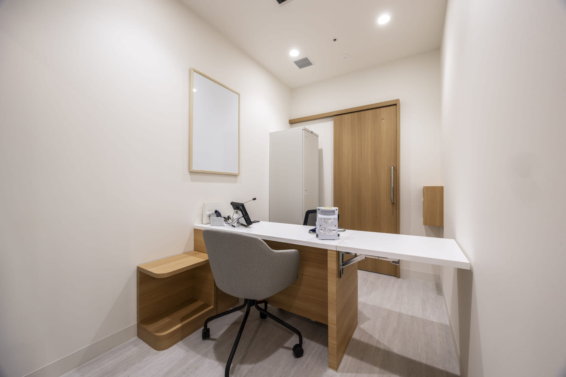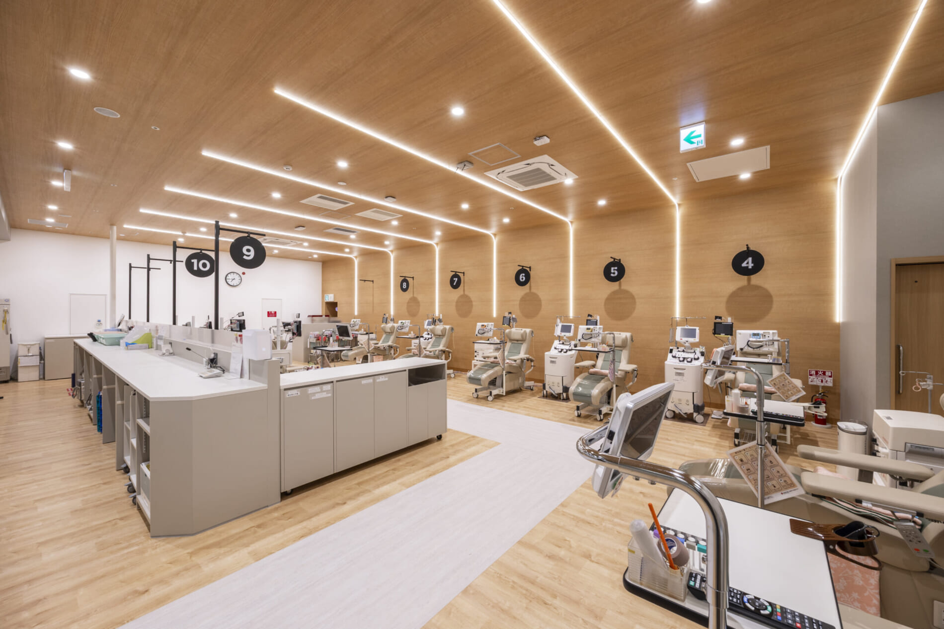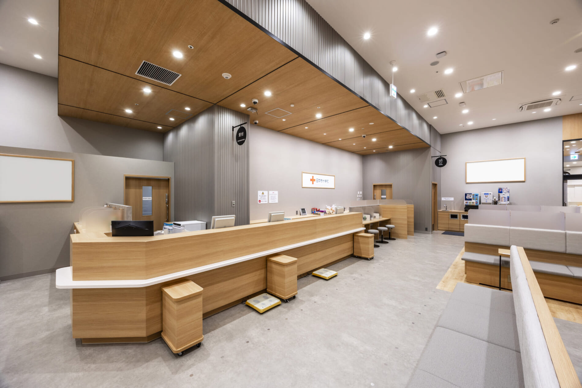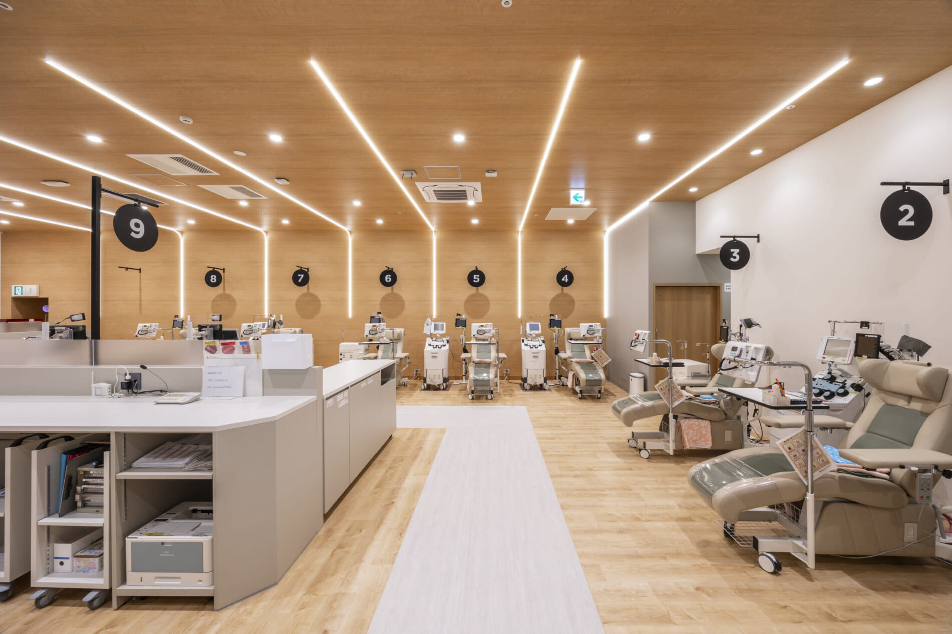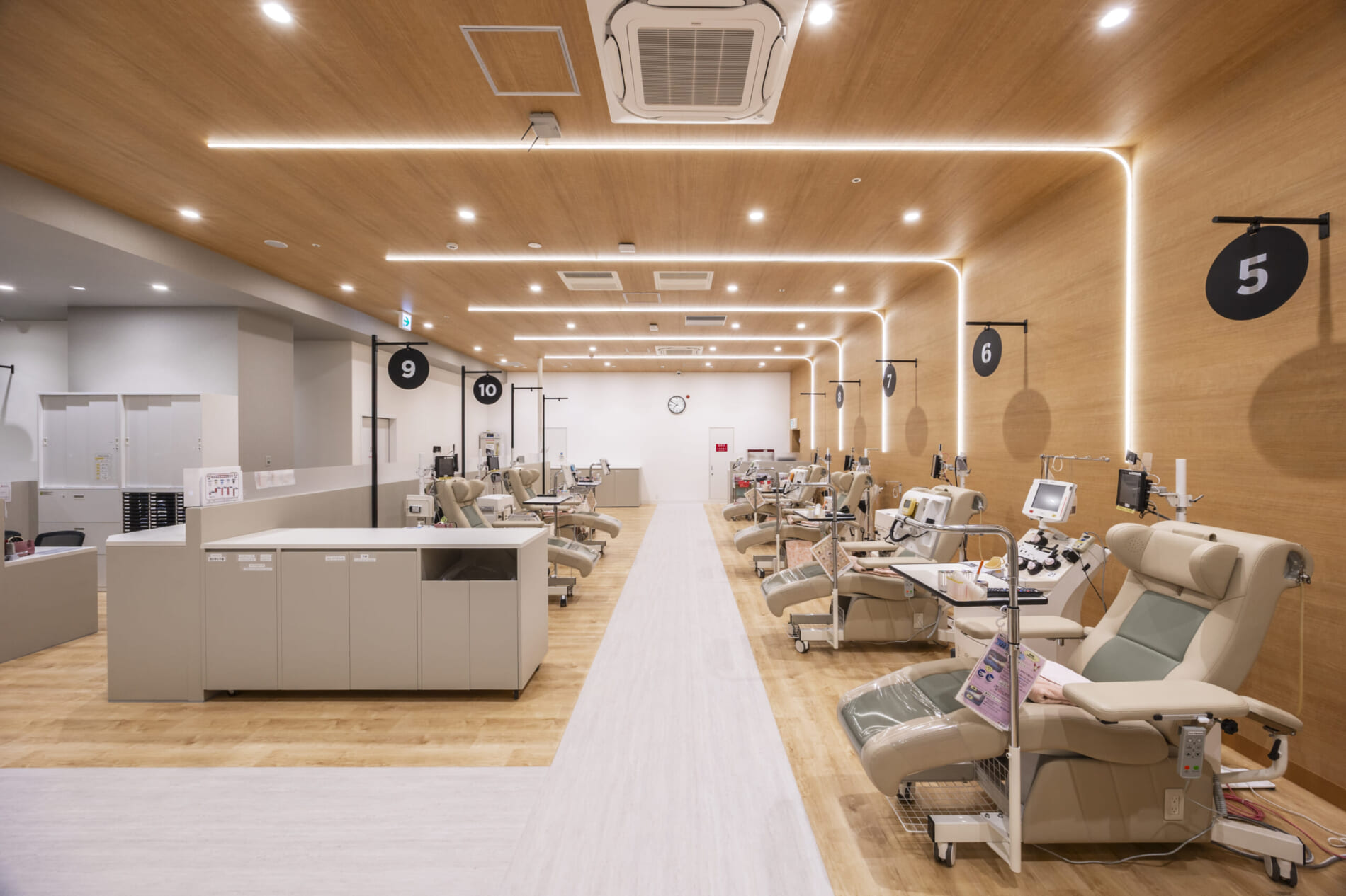 ファサードはガラスサッシとすることで開放的で入りやすい印象に。待合室は金属サイディングと木目の組み合わせでトレンド感を演出しています。採血室は温かみのある木の空間に特徴的なライン照明を大胆に取り入れ、やわらかな光に包まれながら、くつろいで献血いただける環境を整えました。