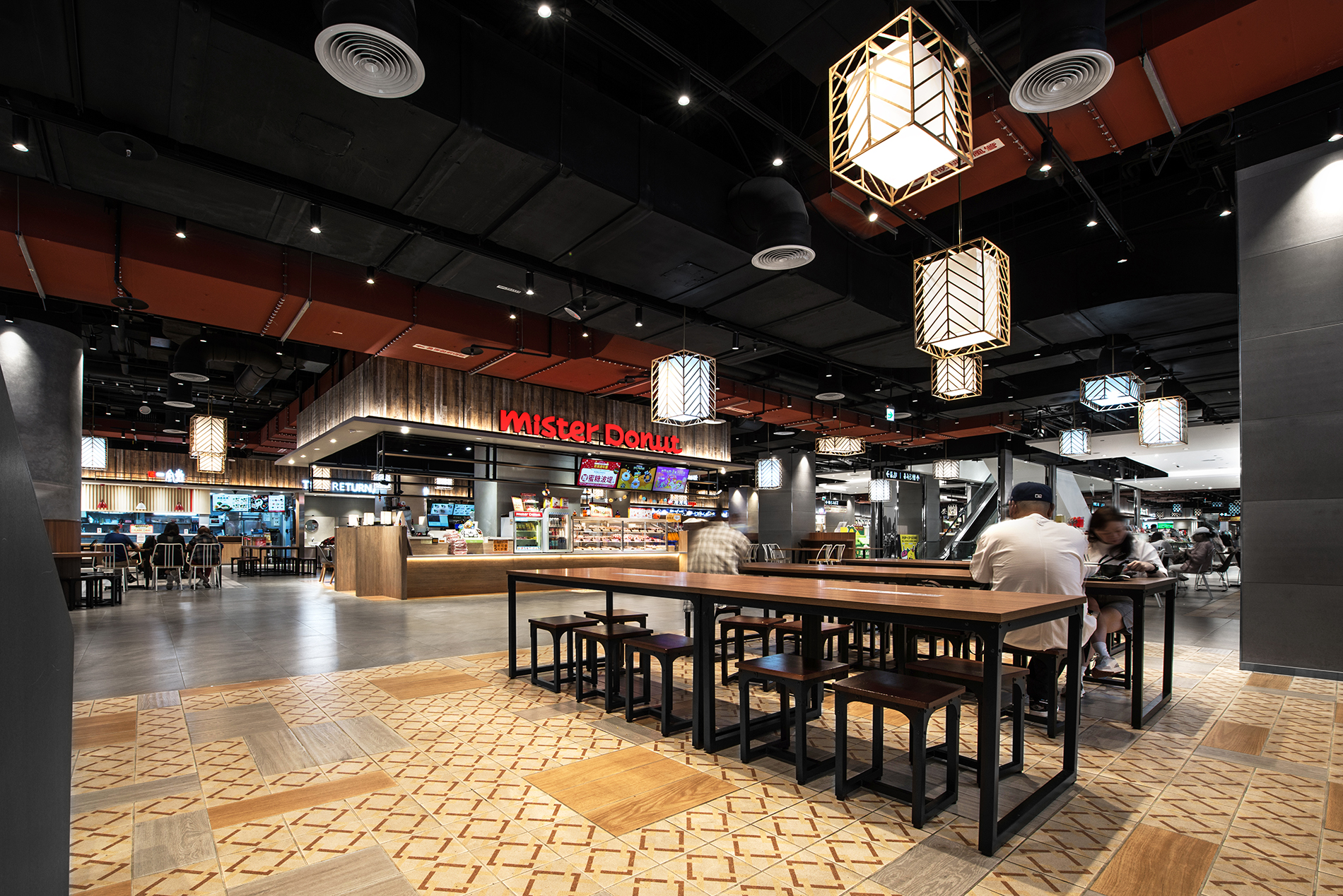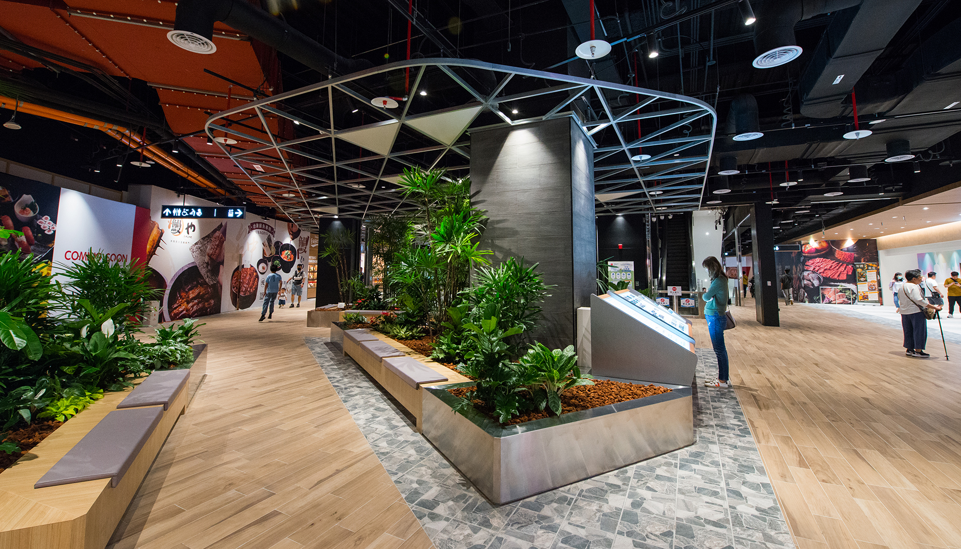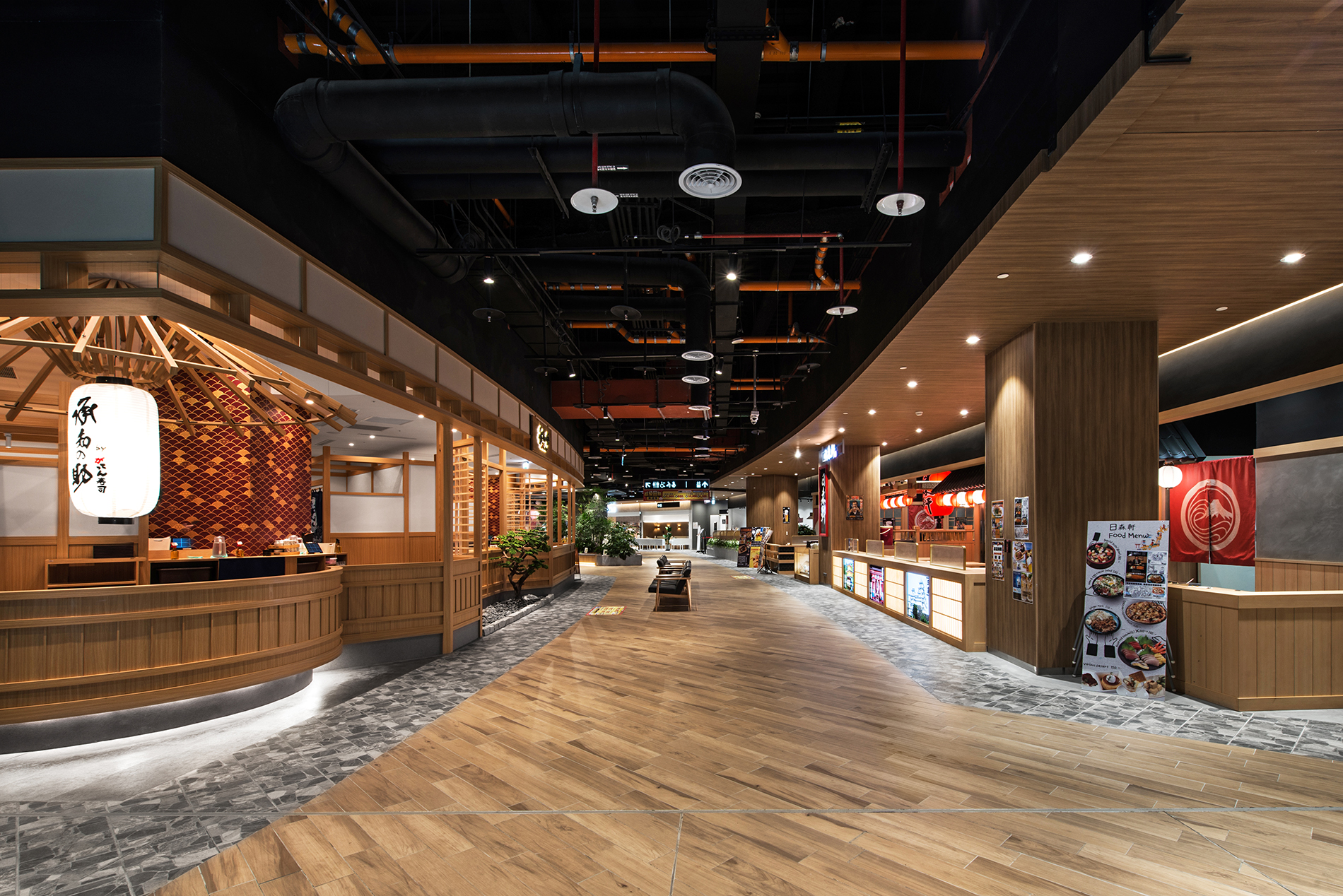 多層階をつなぐ吹抜け空間には水景演出とデジタルサイネージを導入し、来訪者の体験価値を高めるダイナミックな空間を創出しました。地下1階のフードマーケットは “TAIWAN EXPERIENCE” をテーマに、夜市から着想を得た活気とライブ感を演出。オープンでエネルギーに満ちた飲食体験を提供します。