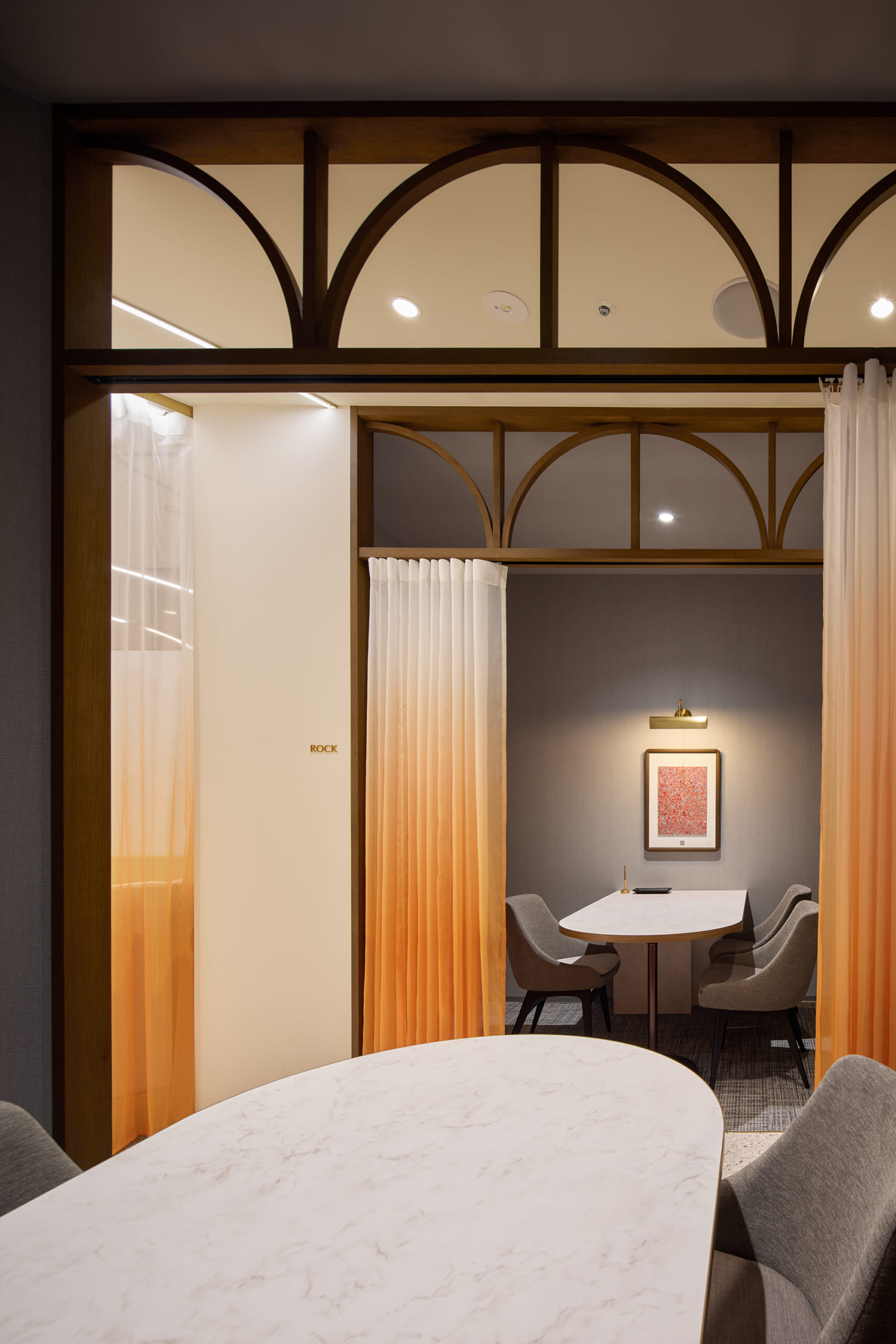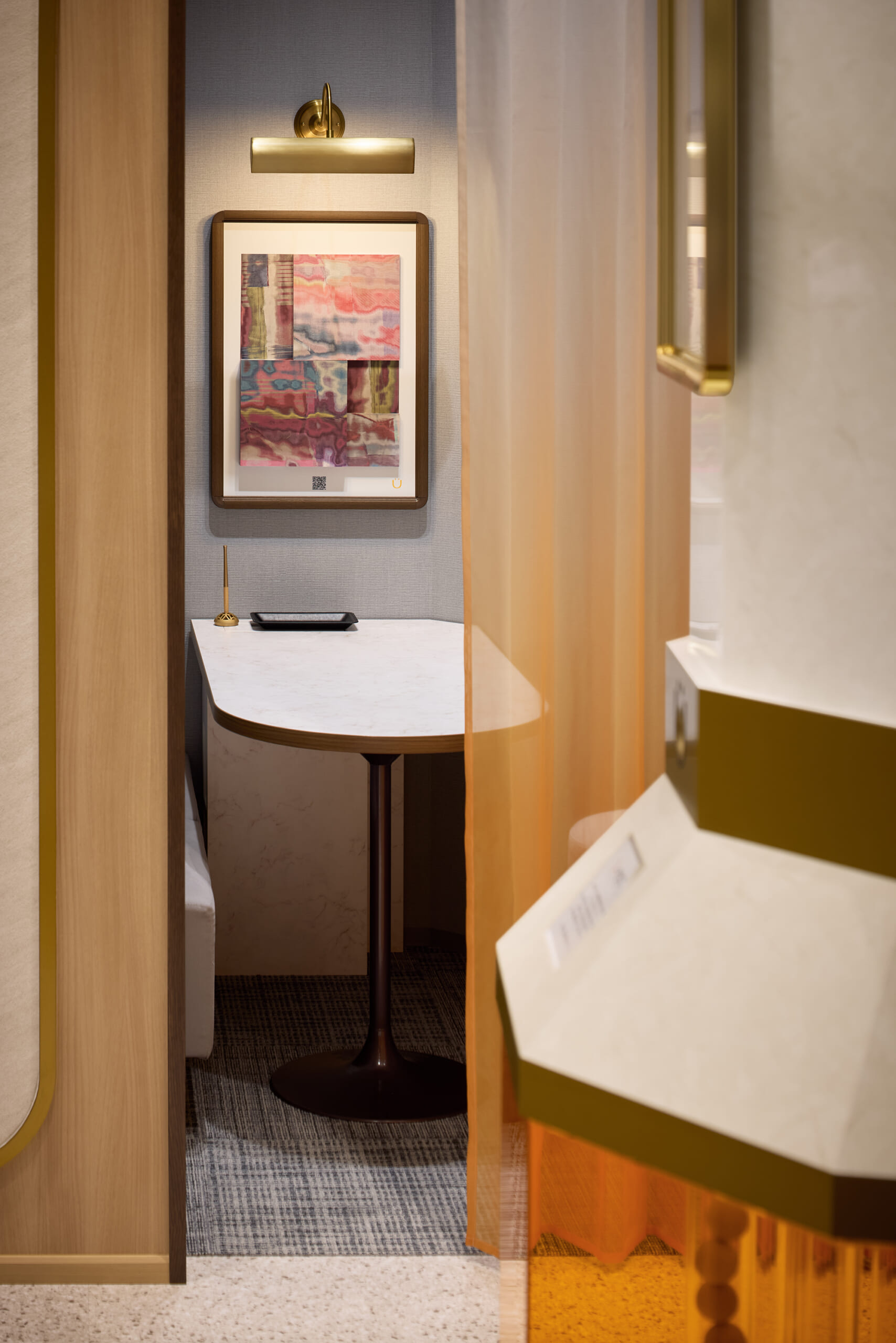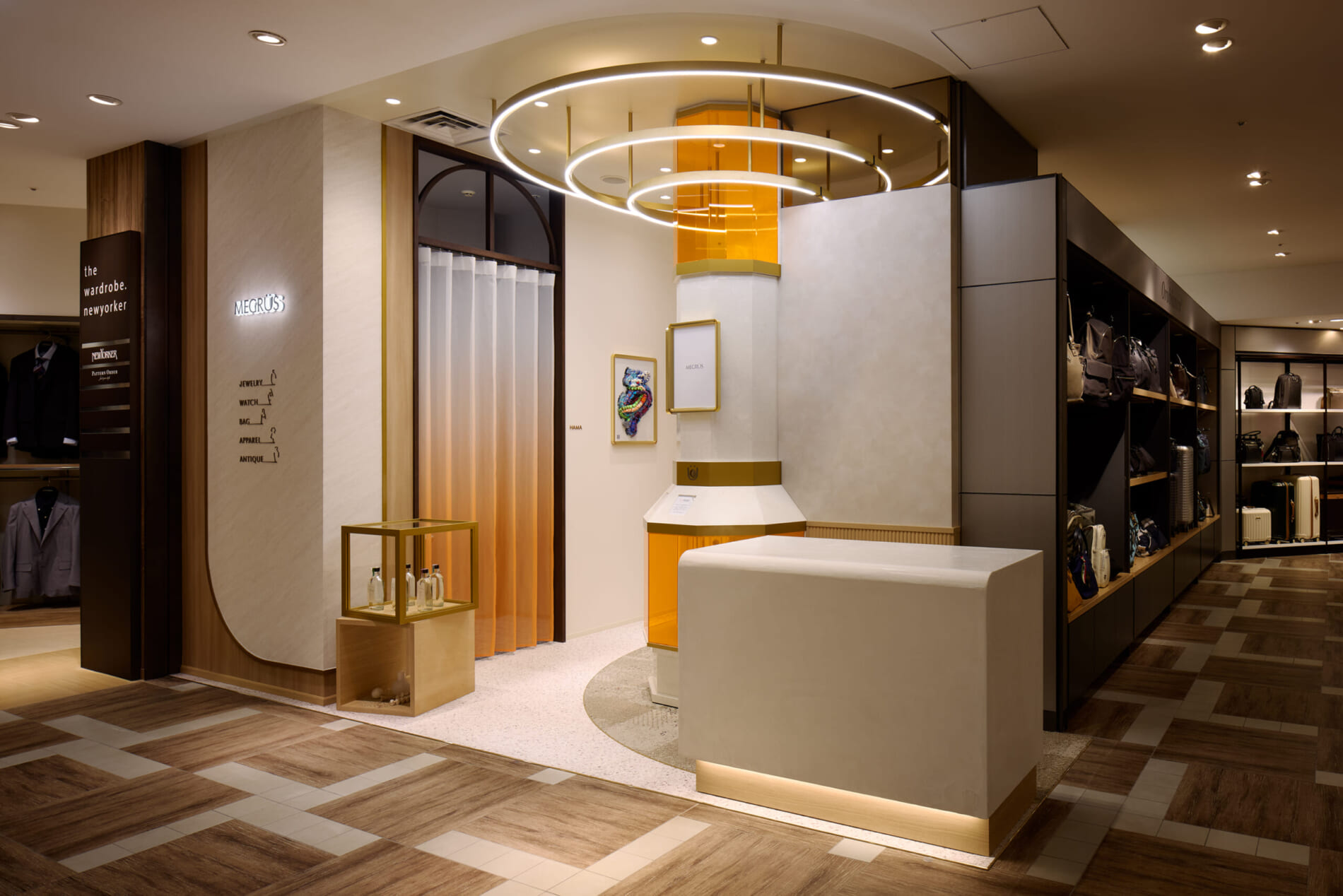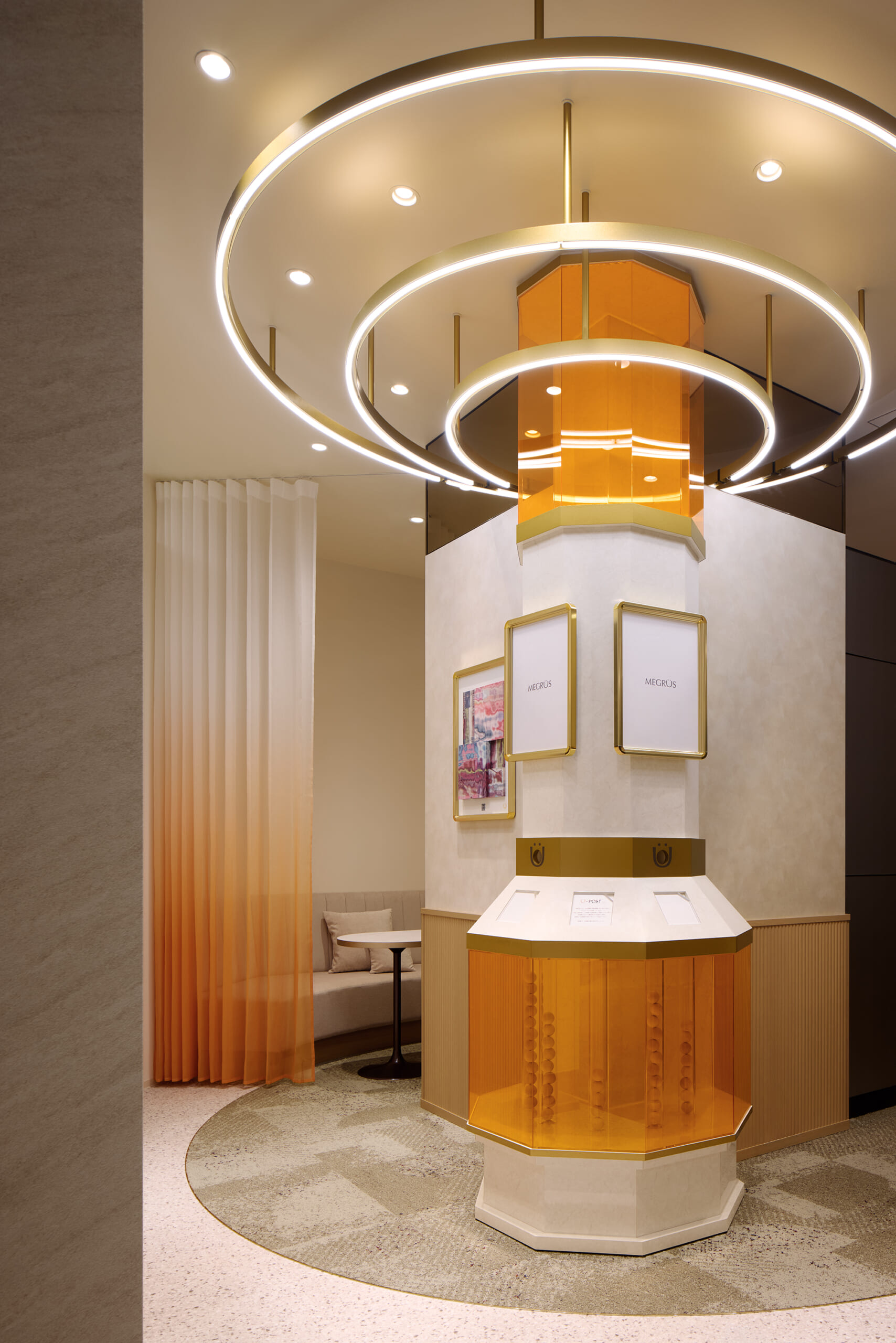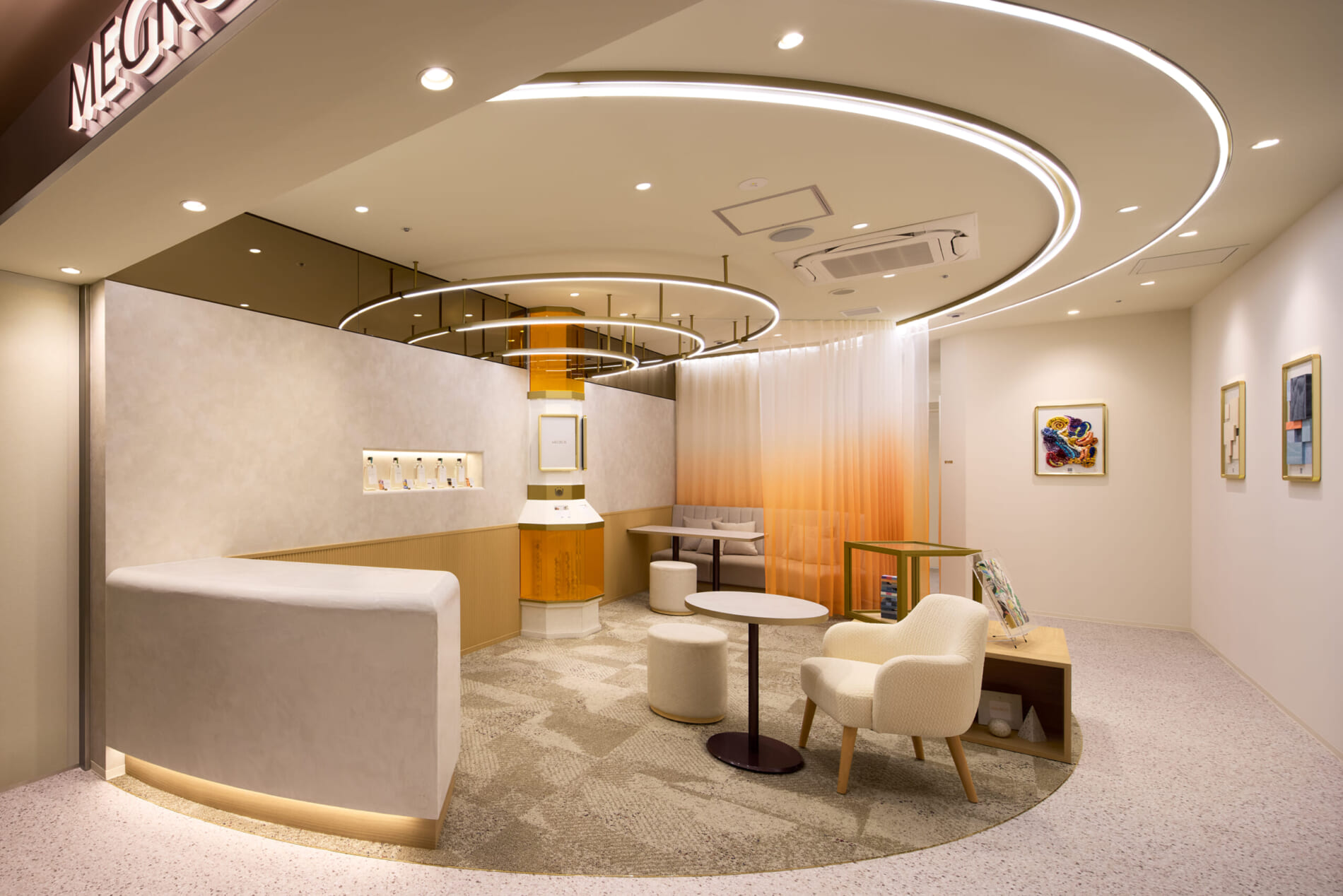 デザインコンセプトは「spread lounge」。内から外に広がるデザインを空間構成の軸とし、お客様の「ときめき」が生まれ、伝播し、循環する空間を創造しました。スタッフとお客様が丁寧に対話できるように、居心地の良いゆったりとしたラウンジを配置。空間の仕切りとしてブランドカラーであるオレンジのグラデーションカーテンを使用し、壁面にはエシカルマテリアルを用いたアートパネルを配置しました。