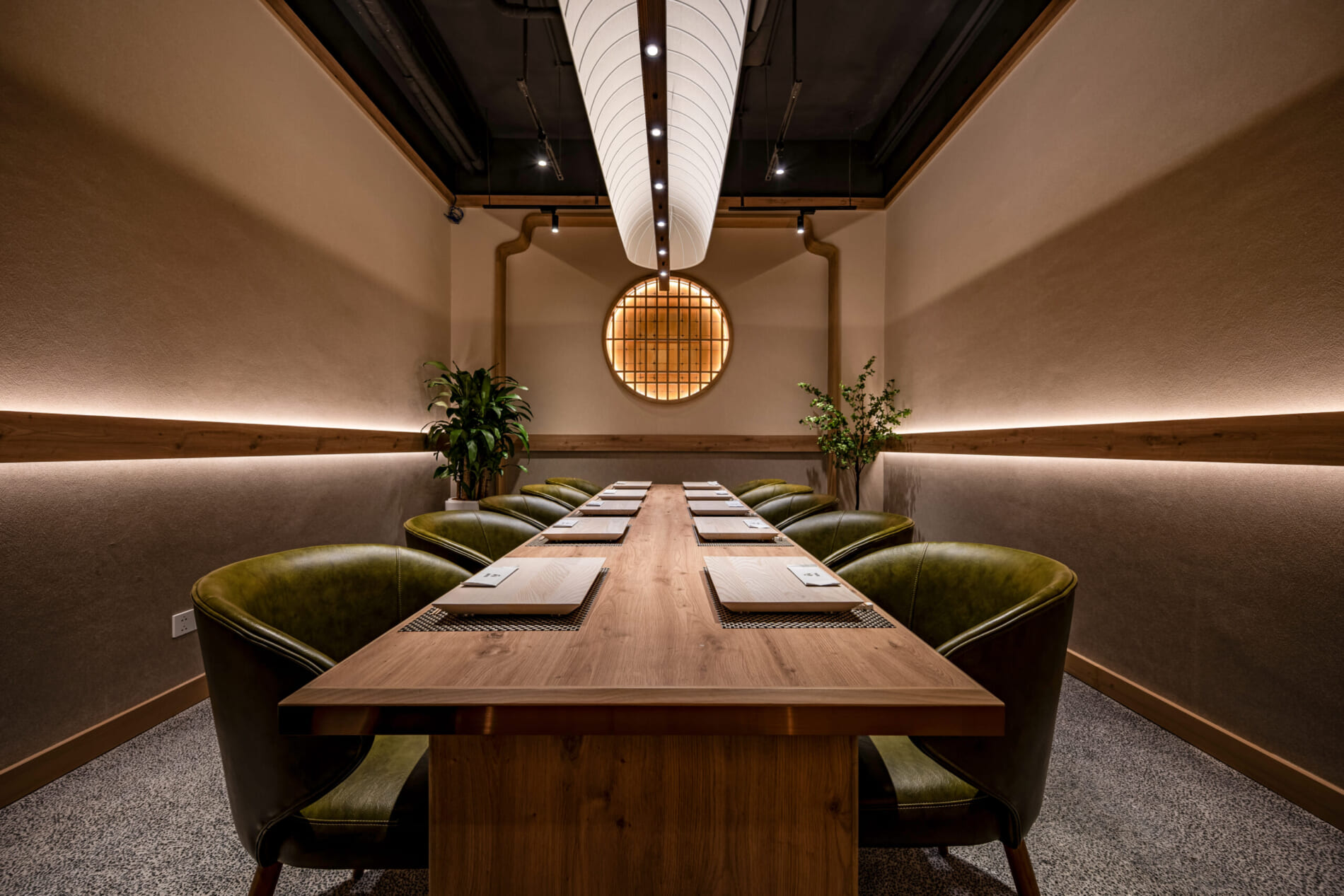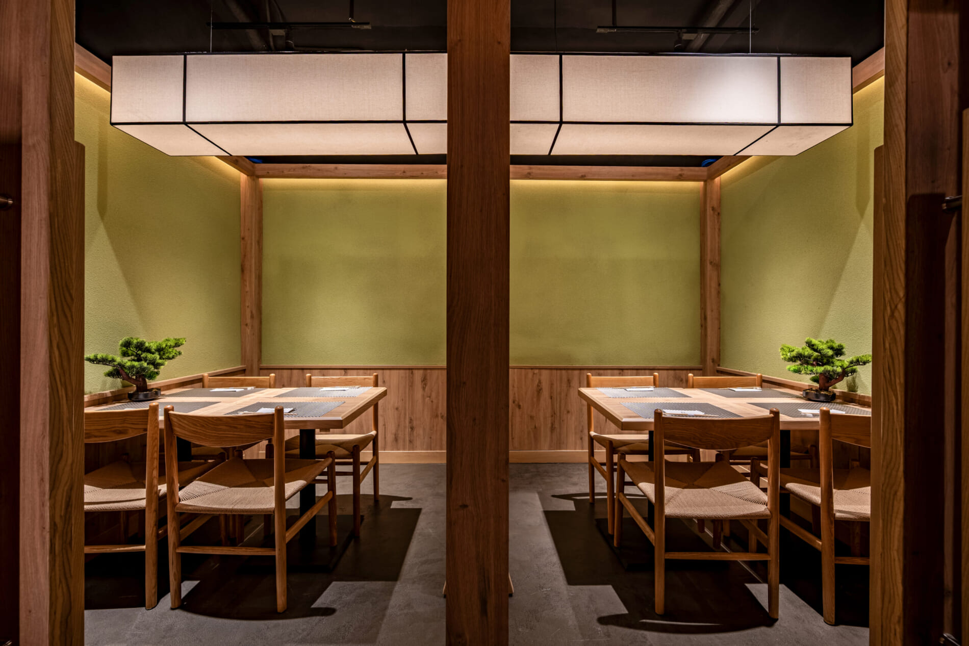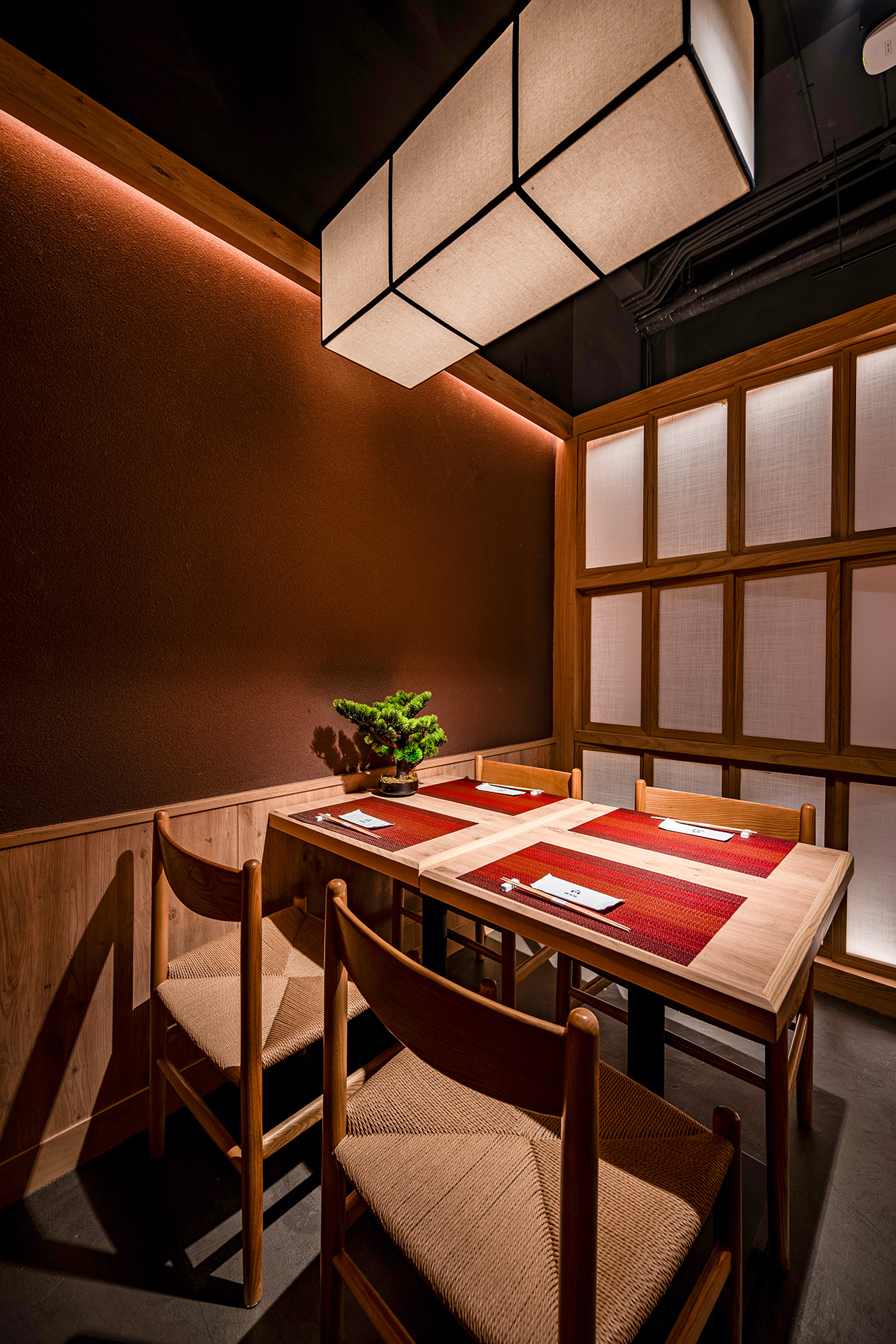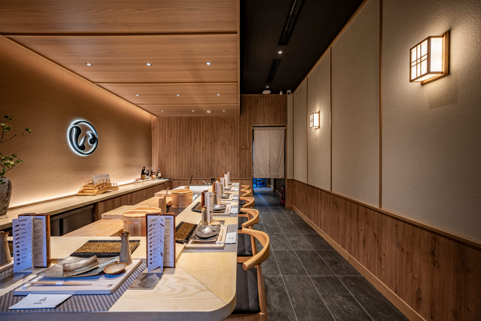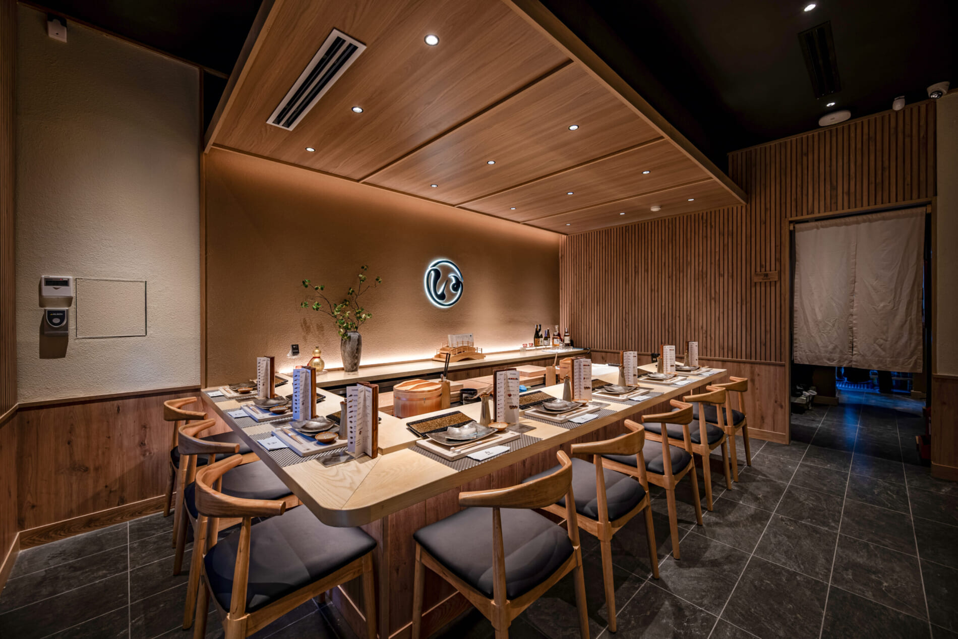 和のイメージに偏り過ぎず、素材・照明・色調で“上質さ”を表現することで、中高級店としての品格と親しみやすさを両立しました。
