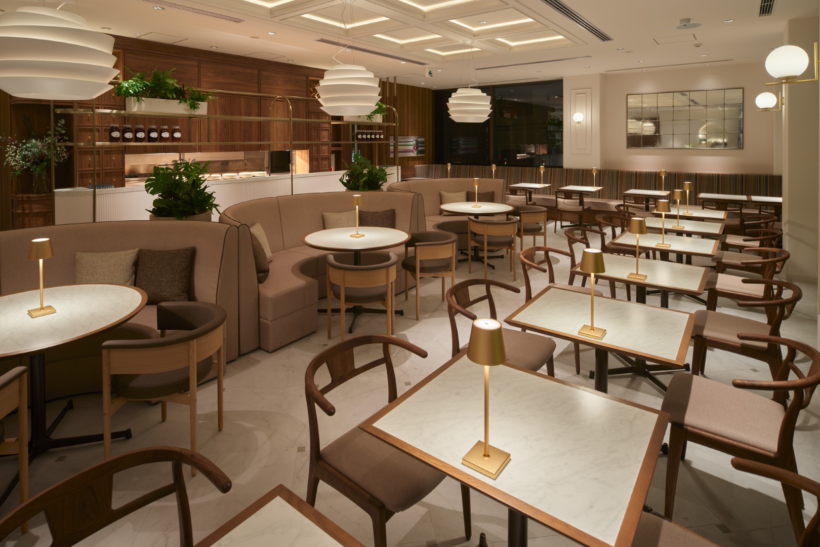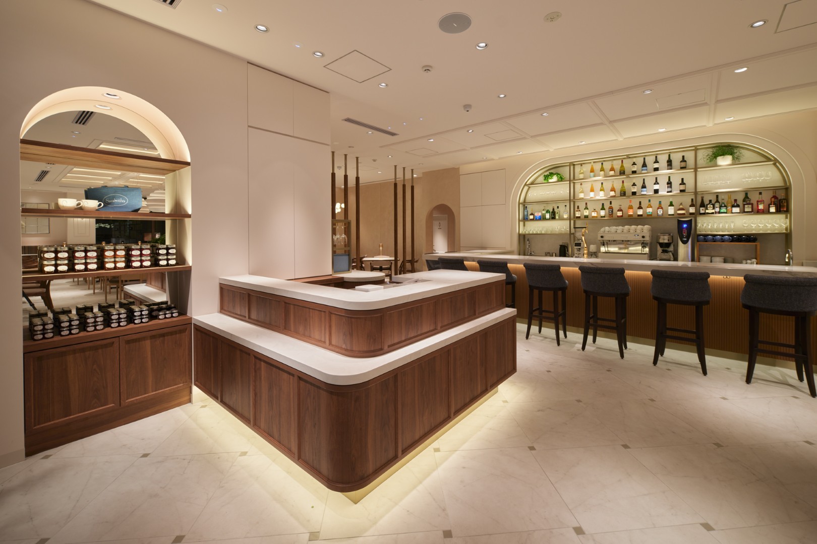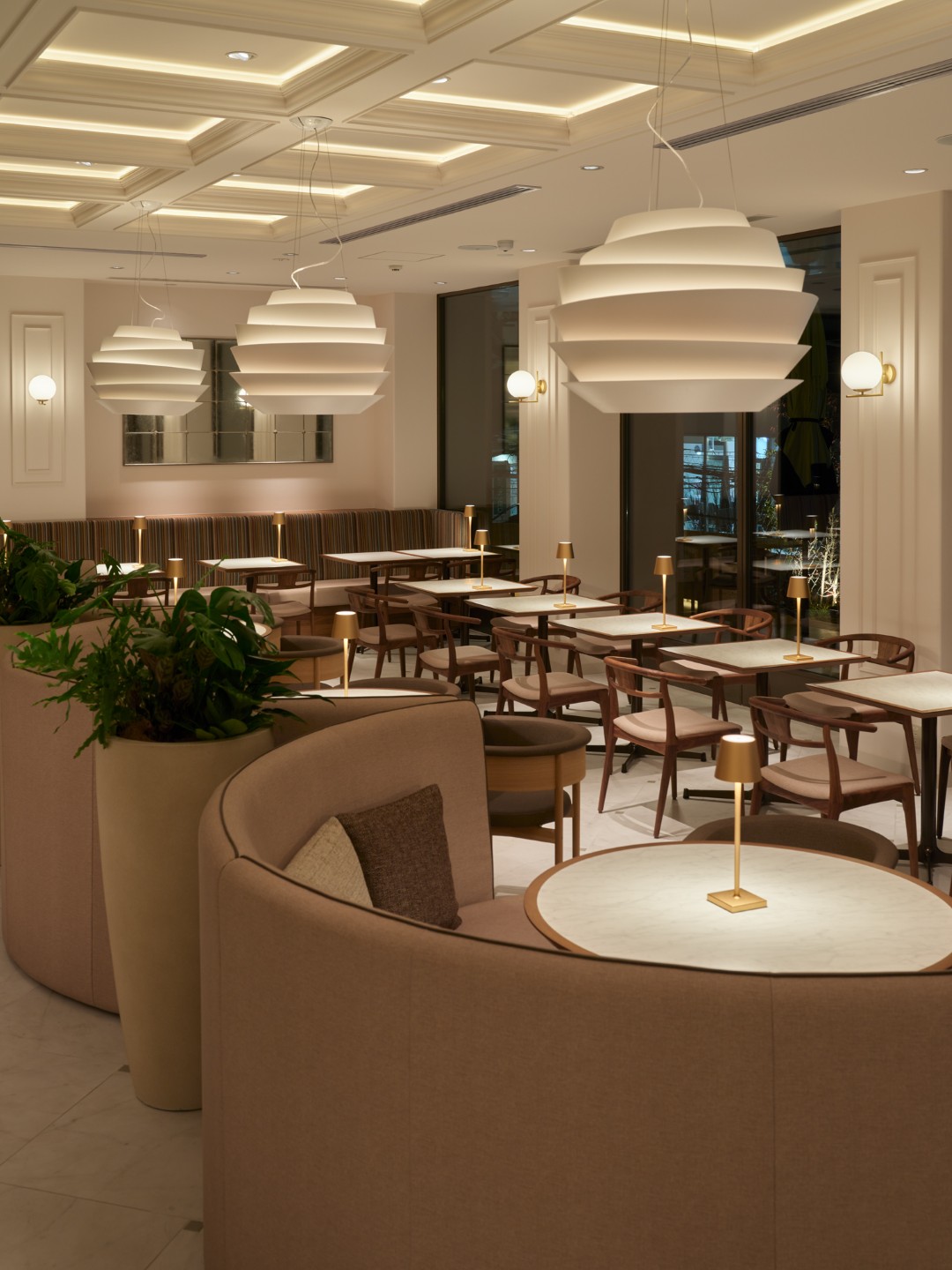 デザインコンセプトは「URBAN CLASSIC COMFORT」。表参道の落ち着いた環境や周囲の緑を店内へ取り込み、柔らかな色調と木調素材、丸みのある家具によって、リラックス感のある空間を構成しています。大理石天板を用いたバーカウンターは朝から夜まで幅広いシーンに対応し、壁面にはニューヨークのアーティストによるアートワークを配置することで、空間に程よいアクセントを加えています。昼は自然光、夜は間接照明によって雰囲気を切り替え、時間帯ごとに異なる使われ方に対応するデザインとしました。