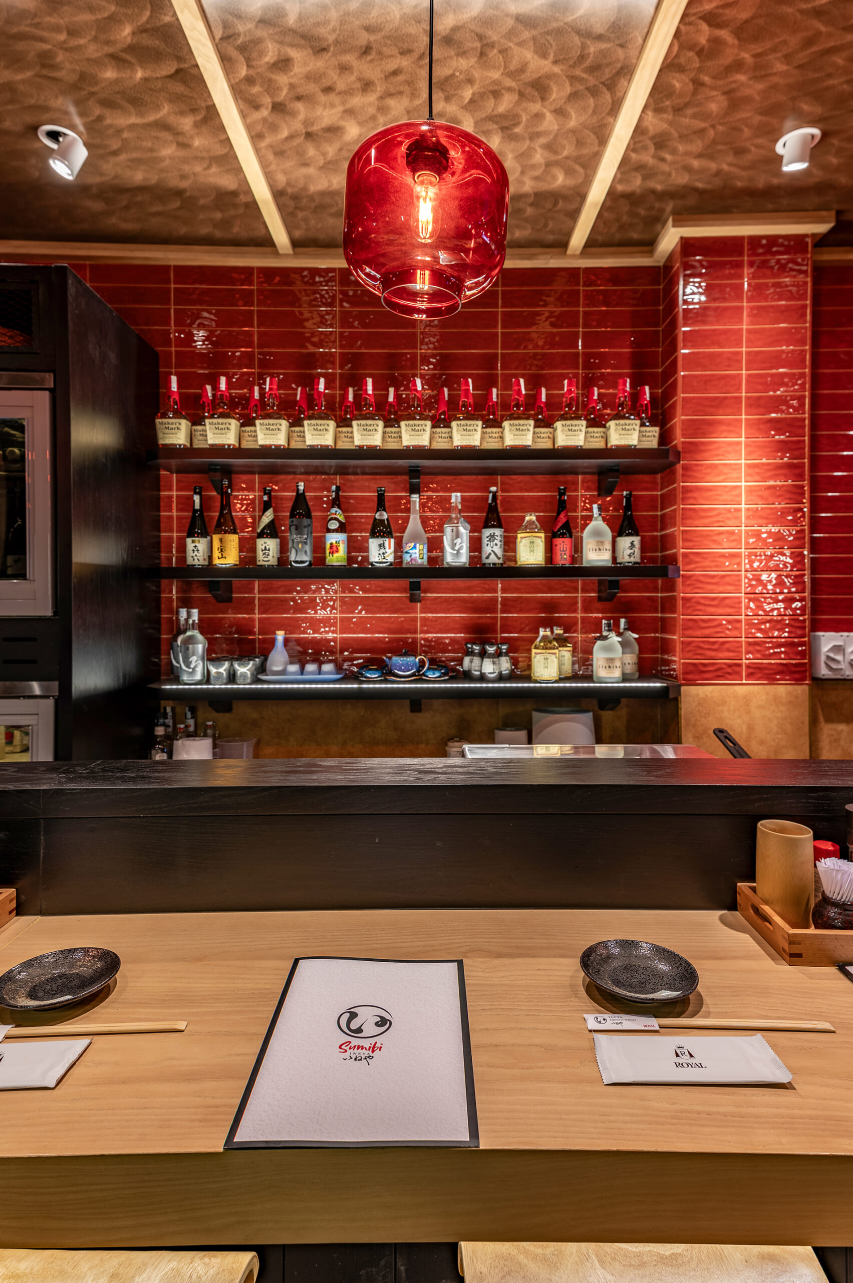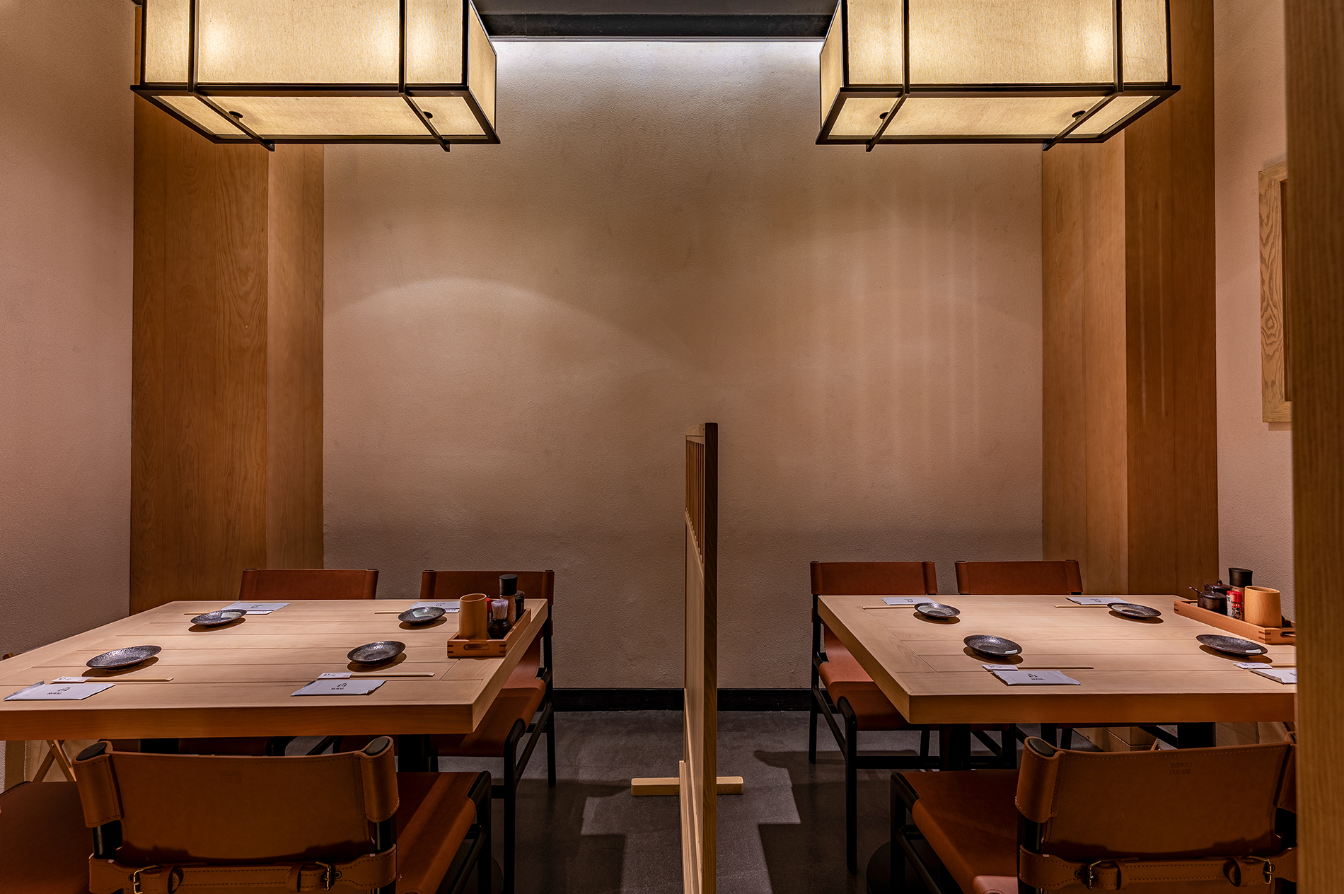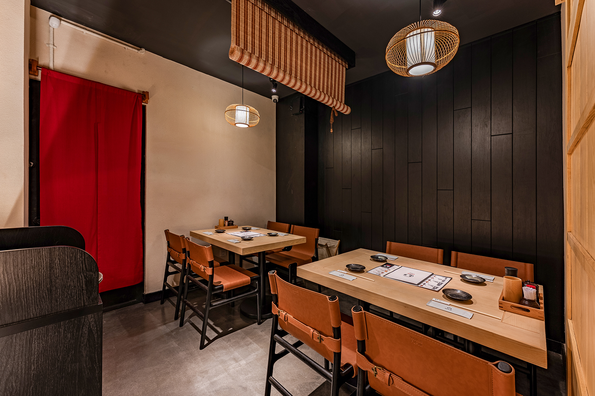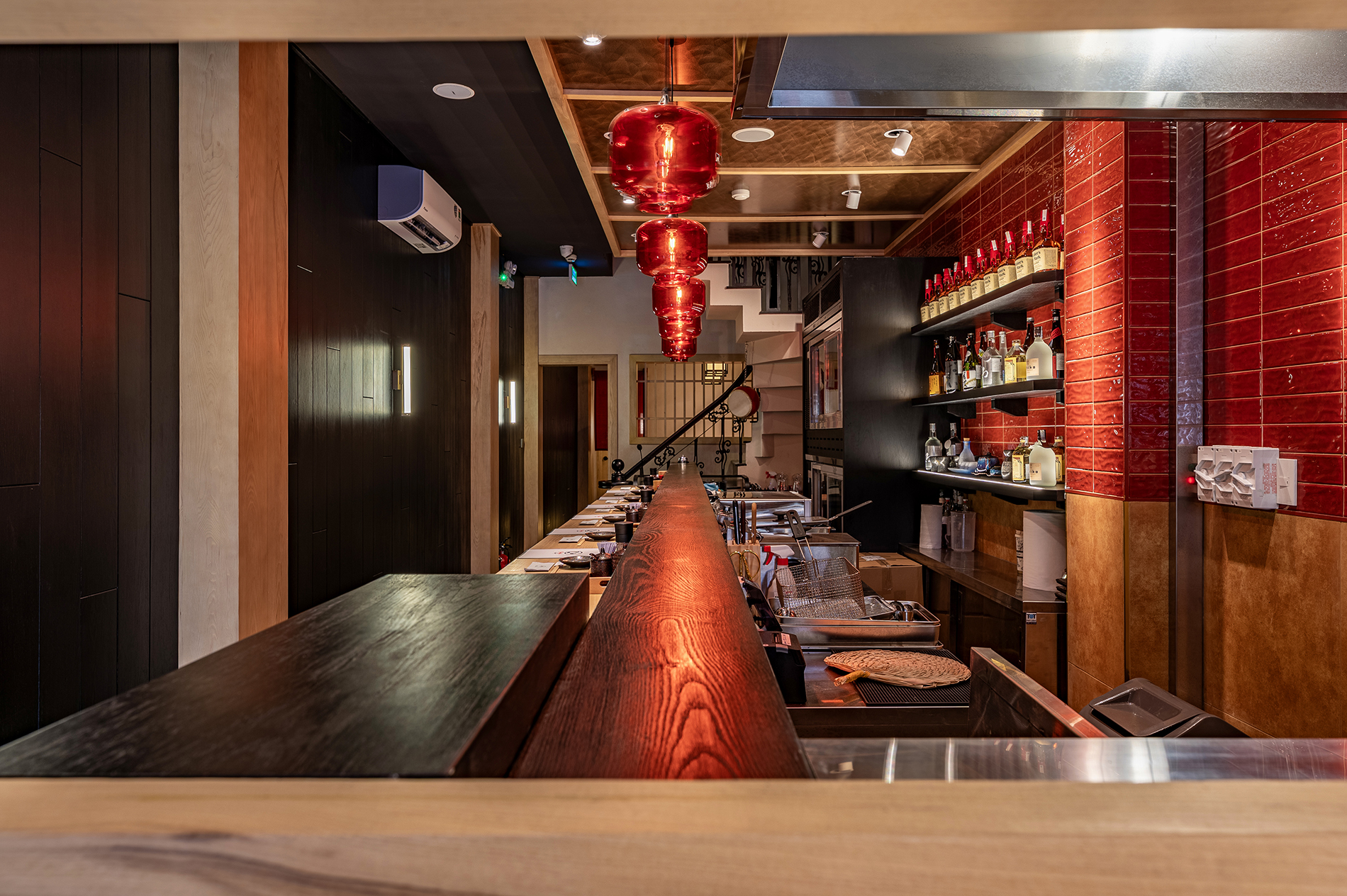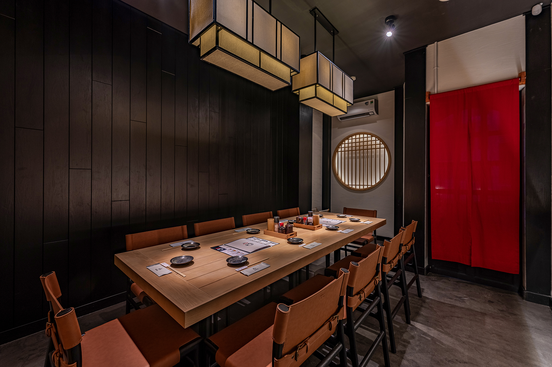 ベトナムの地で、日本の趣を感じられる心地よく上質な空間でありながらも、気軽に立ち寄れるカジュアルな日本料理店を創り上げました。素材や部分的な様式には伝統的な日本の要素を取り入れつつ、スケルトン天井や赤いペンダントライトなどでカジュアルさを演出。黒染色とナチュラル色の木材を基調に、赤をアクセントカラーとして組み合わせることで、遊び心と上品さを併せ持つ、メリハリのあるデザインとしました。素材の質感や風合いにもこだわり、空間の上質さを引き立てるために、厳選した本物の素材のみを使用しています。