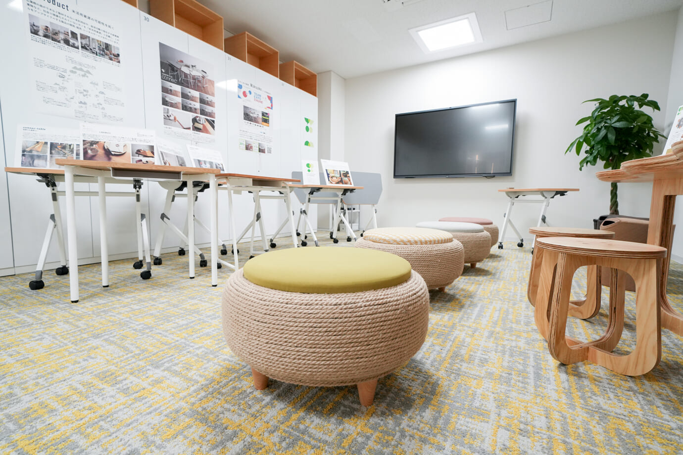 廃タイヤをアップサイクルしたスツール、工場端材や未活用資源を活用したワーキングデスク「つながるつくえconnec®」を展示。さらに、福岡・大川の木材くずを活用し3Dプリンタで生成したスツールや、5軸のCNC加工で制作したデスクなど、最先端の技術を活用してものづくりに取り組む九州の企業と連携して制作したプロダクトをご紹介しました。