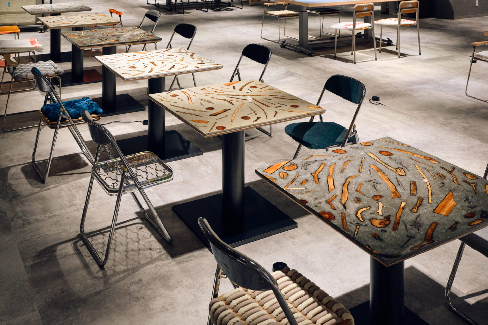 さらに、廃校の学校机・椅子や、廃棄予定のポンプ車、工事現場のケーブルドラム、使い終えたスノーボードなど、さまざまなところで不要となったものも再活用し、家具や什器へと創り変えています。