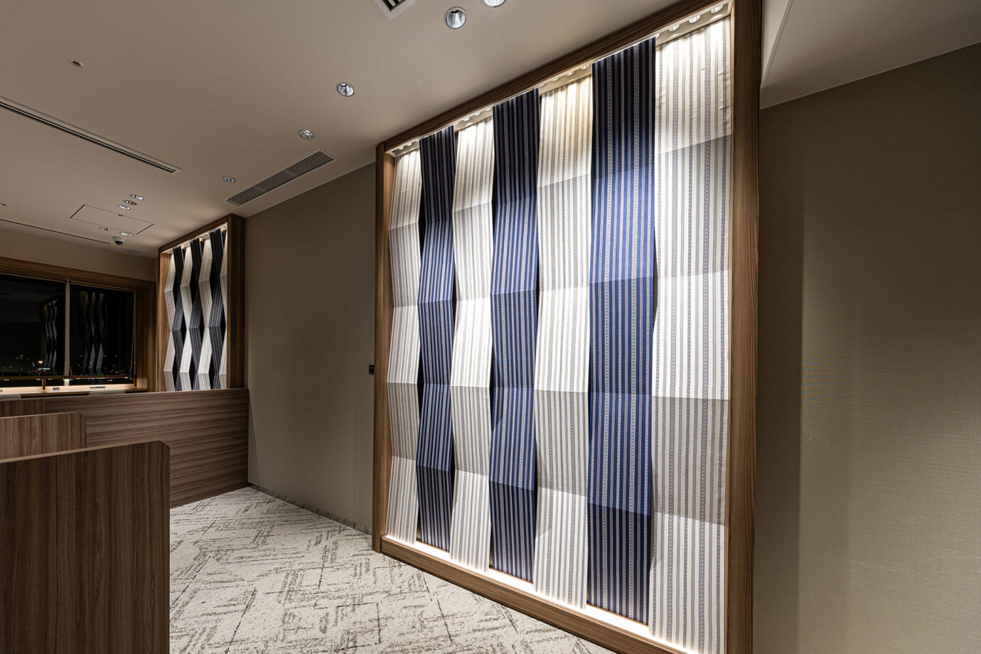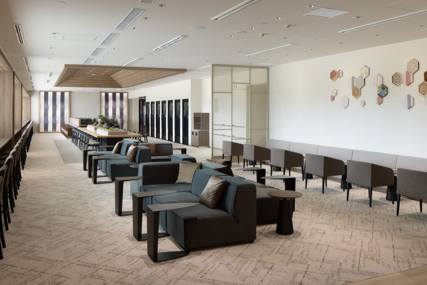 航空会社ラウンジ「ラウンジ福岡」では、新進気鋭の博多人形師・中村弘峰氏の作品「黄金時代 龍の舞」のお出迎えから始まり、大川組子、博多織、小石原焼など随所に散りばめられた福岡の伝統工芸品を楽しむことができます。博多織の壁面ディスプレイは、4パターン用意し、季節に合わせて張り替えられる仕様としました。