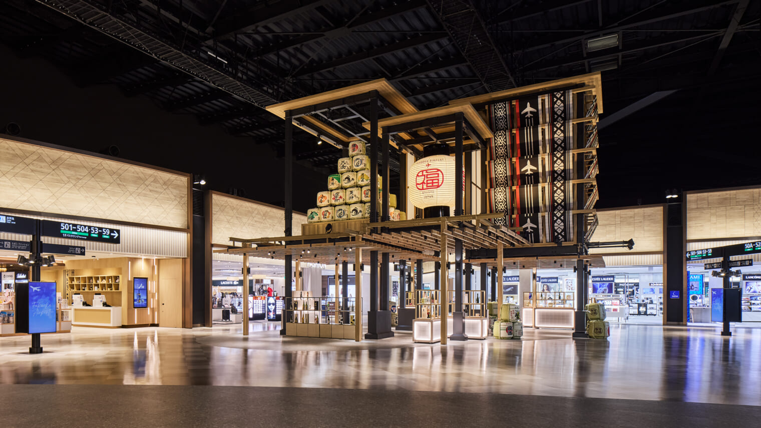 約4倍の広さとなった免税店エリアは「中洲の街並み・屋台・祭りの山車」という福岡を象徴する3つの要素を取り入れ、福岡の光景を連想させる空間へと一新。巡った観光名所のひとつとして数えられる場となることを目指し、日本の雰囲気や文化を楽しむことができる空間を創り上げました 。
