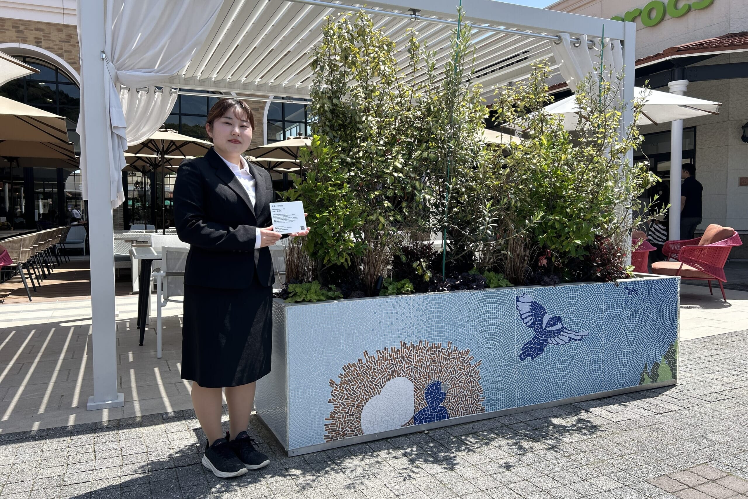 タイルアートプランターの素材には、環境配慮型の素材等のサステナビリティを意識したリサイクル素材を活用しました。セラミックやタイルを使った装飾は、彩り豊かで表現の幅が広く、佐賀らしさや地域の魅力を表現しながら、スパニッシュ・コロニアルをイメージした鳥栖プレミアム・アウトレットのさわやかで明るい空間に調和させています。