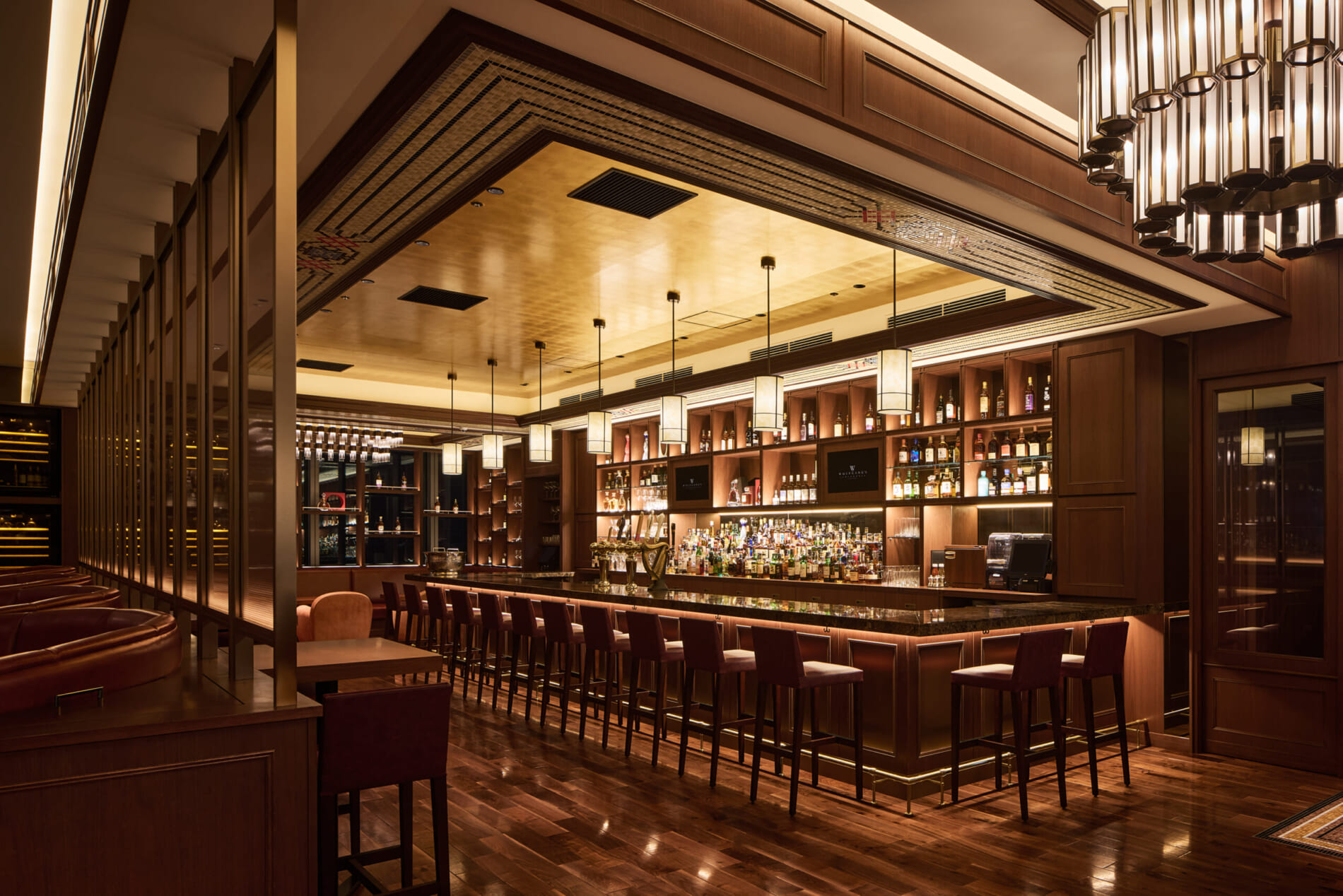 全面ガラス越しの夜景と一体化した客席フロアは、掘り上げ天井により天井高を確保し、開放感あふれる空間を実現。モダンな形状を集積した特注シャンデリアが、クラシックとモダンの融合による新しいラグジュアリーを演出します。バーエリアと客席の間仕切りには間接照明を組み込んだガラスで仕上げ、夜になると柔らかな光でゾーニングされる演出としています。