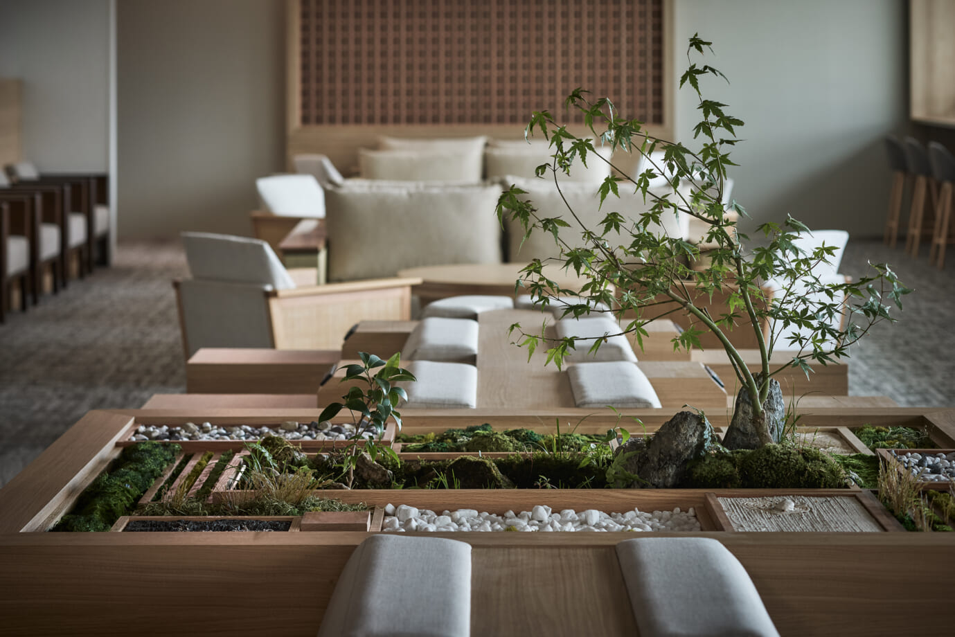 単に面積や店舗数を拡張するだけでなく、出国前エリア、ラウンジ、コンコース、到着ロビーなどすべてのエリアで、自然に日本・福岡文化を体感できる設計にしています。四季の移ろいを映す坪庭や、伝統工芸を用いた表現、祭りや日本の情景を想起させる意匠など多様な要素を取り入れ、文化体験と滞在性を両立させた空間を創出しました。
