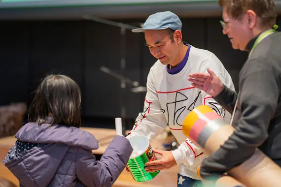 企業活動で生じたさまざまなマテリアルを使って楽器を作り、その場で即興演奏。エシカルな学びと音楽の魅力を伝え、大人も子どもも一緒に楽しみました。思わず体を揺らしてしまう音楽が鳴り響くと、自然とみんなが笑顔になります。会場全体が心地よい一体感に包まれ、「未来にやさしい空間」を参加者の方々と一緒につくることができました。