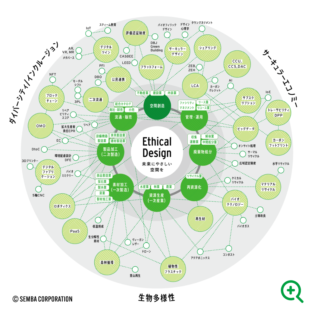 私たちの考えるエシカルデザインとは、人の暮らしはもちろん、その先にある地域社会や自然環境にまで配慮し、資源循環を前提としたデザインです。企画や設計の段階から、空間を使い終えた後のことや次のリニューアルを想定し、「つかう資源」と「すてる資源」を循環させ、サーキュラーエコノミーの実現を目指しています。分断されていたサプライチェーン上のパートナーと連携することで、資源循環を前提とした空間づくりを実現し、未来にやさしい空間を共創する取り組みです。
