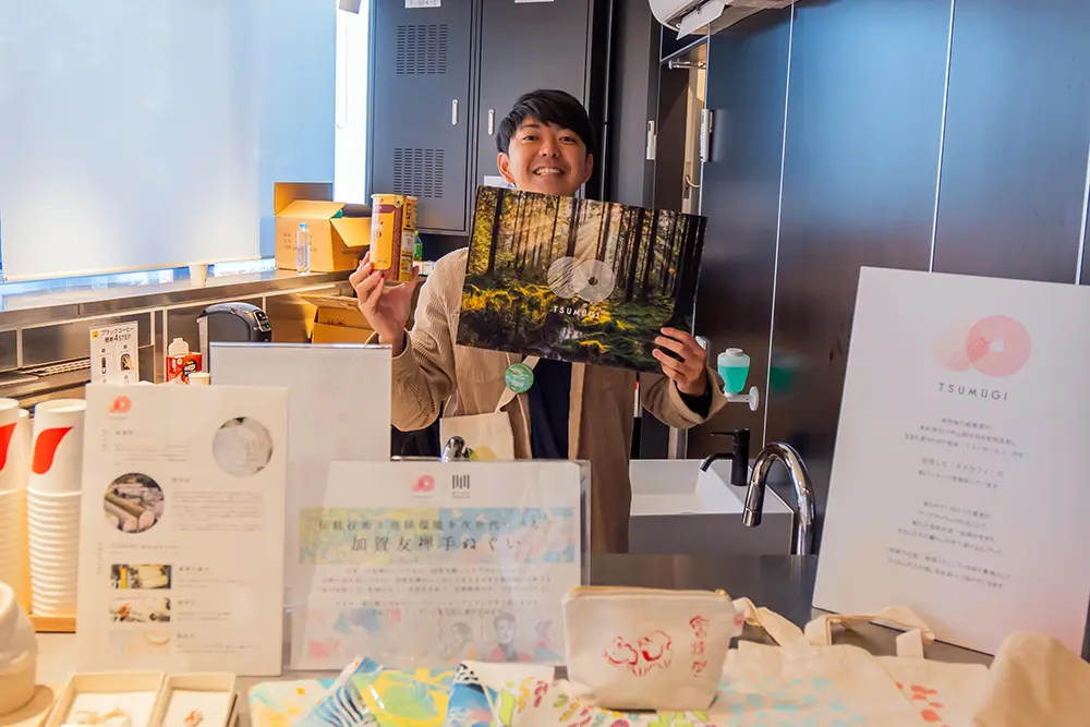 「ネスカフェ ゴールドブレンド」を中心に、心も体も温まるホットドリンクを提供いただきました。イベント会場の高揚感とカフェのようなカジュアルな雰囲気が混ざり合う空間で、さまざまな対話が生まれました。使用後の紙パッケージや森林の手入れから発生する間伐材を、紙糸にアップサイクルするネスレ日本のプロジェクト「TSUMUGI」の展示も好評でした。