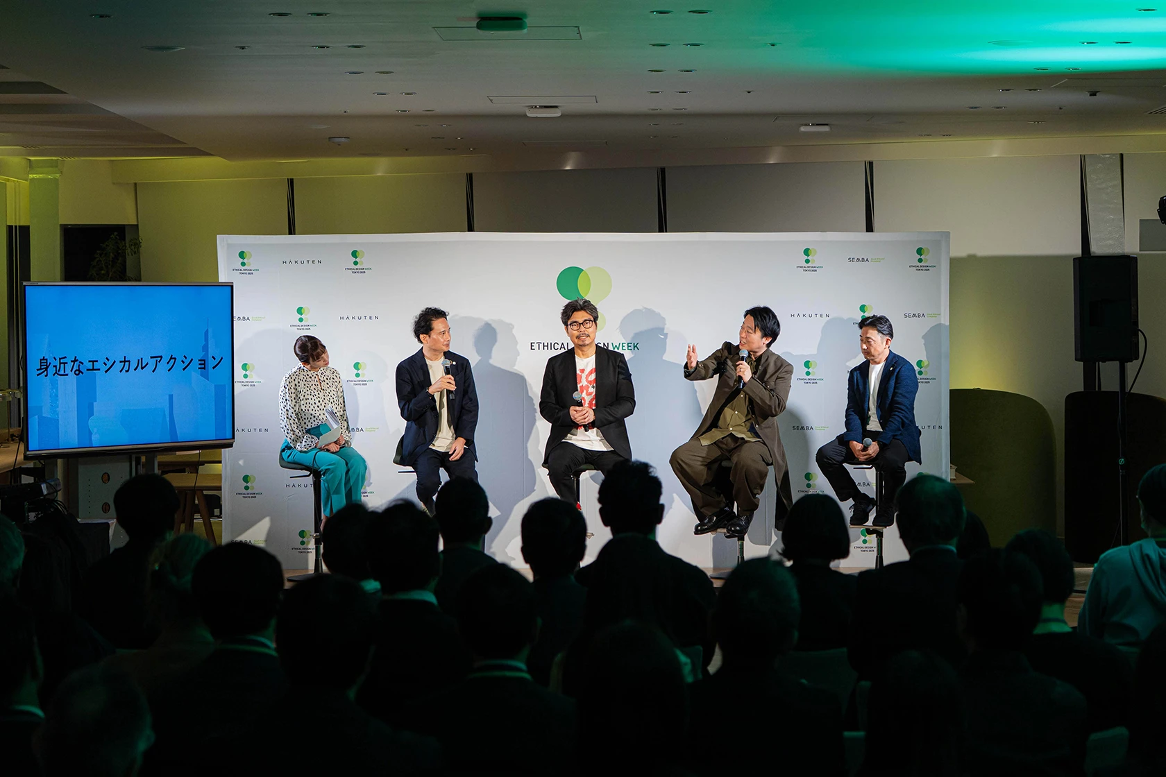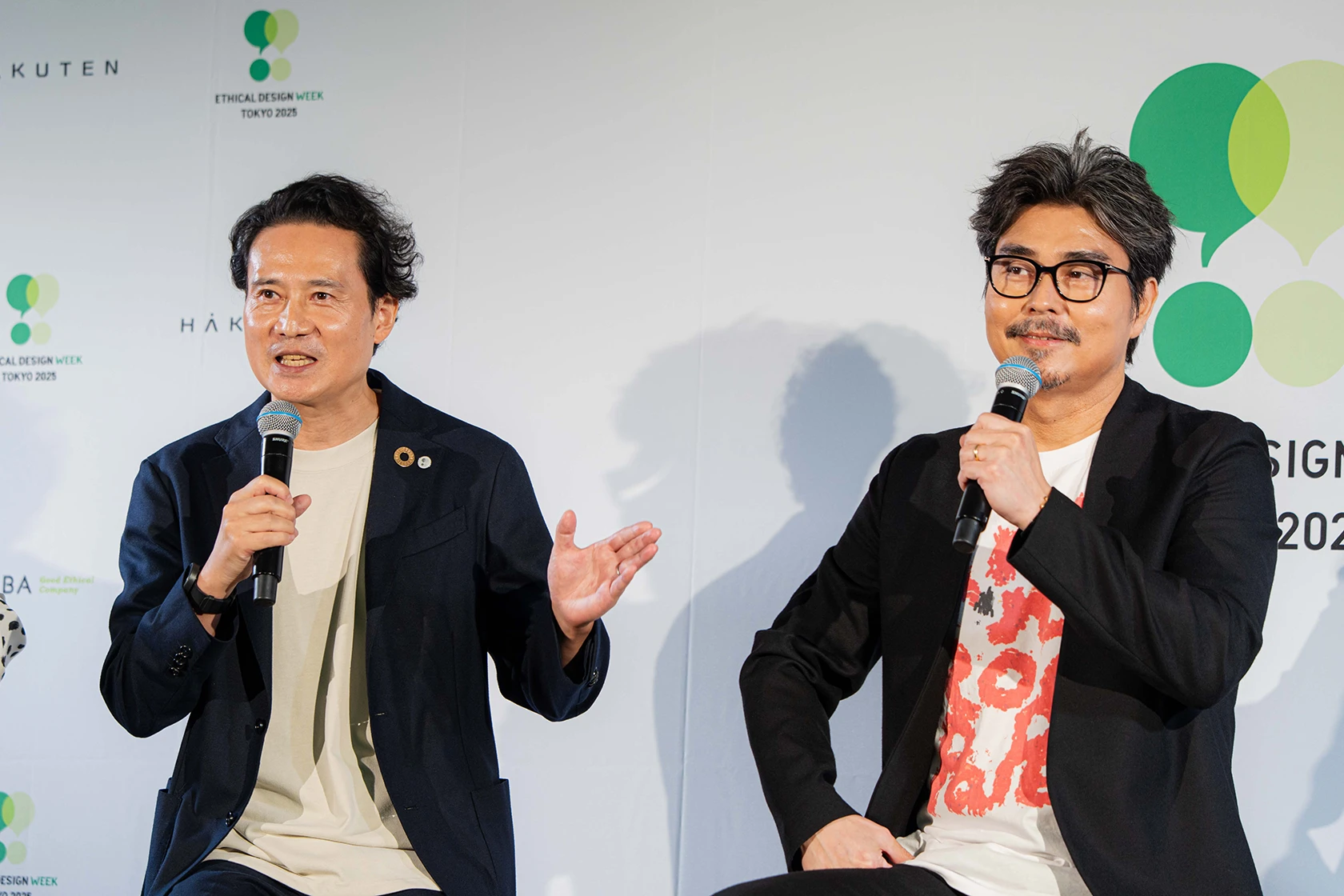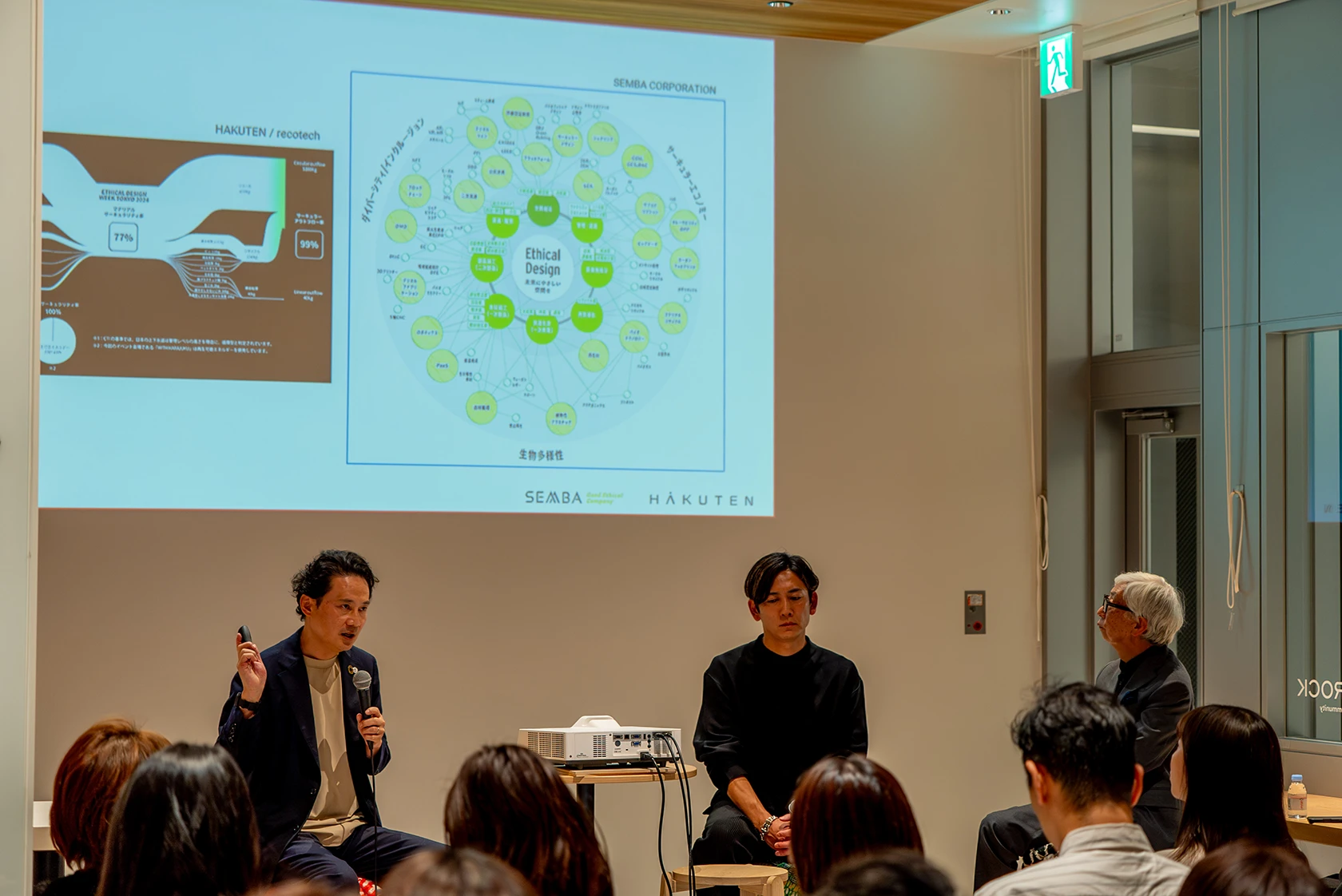 初日夜のオープニングレセプションでは、主催者が描くエシカルデザインの未来像をプレゼンテーションが行われました。さらに、展示出展者でもある俳優・小澤征悦氏やイベントディレクター・坂口真生氏を交え、「エシカルとビジネス」「身近なエシカルアクション」をテーマにトークセッションを実施。参加者や共創パートナーが集うネットワーキングでは、活発な交流が広がる中で、「ETHICAL DESIGN WEEK」のコミュニティが着実に育っていることを感じられる場となりました。