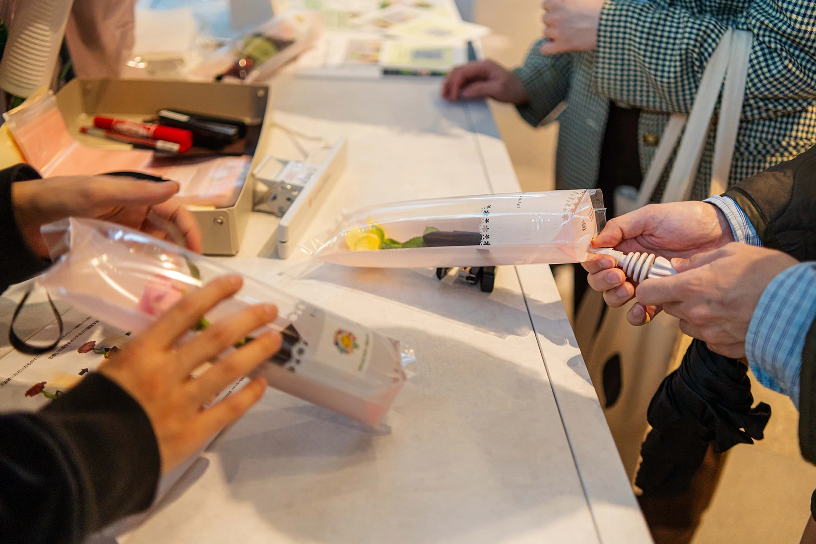 フラワーロスの削減や花農家の支援につながる、規格外のショートローズを用いたノベルティをプレゼントしました。ご自宅やオフィスなどお好みの場所で花の彩りを楽しんでいただくことを通して、小さな一輪のバラが、資源を大切にする意識や花の持つ力を改めて感じさせるきっかけとなりました。