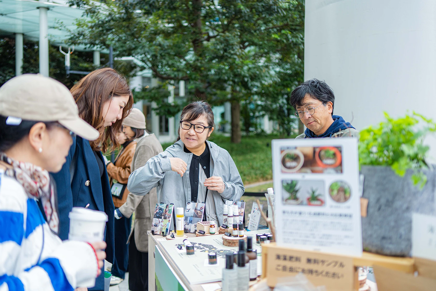 「City Green Fes.」では、秋空の下でヨガ教室や、オーガニックや無添加の多彩なショップが並ぶマルシェを実施。訪れた人々がエシカルなライフスタイルを楽しく体験できる場となりました。最終日の夜には、ゴミを捨てる動作から生まれる音を使ったライブパフォーマンス「Trash Party」が3日間のイベントを締めくくり、広場全体が心地よい熱気に包まれました。